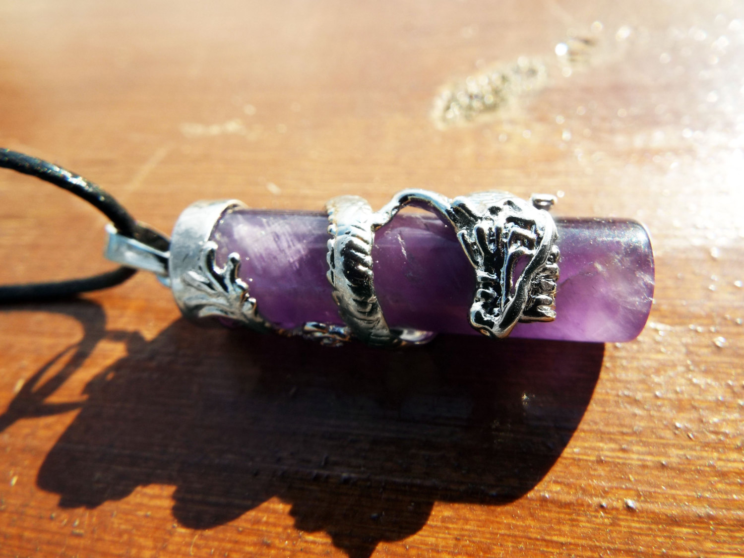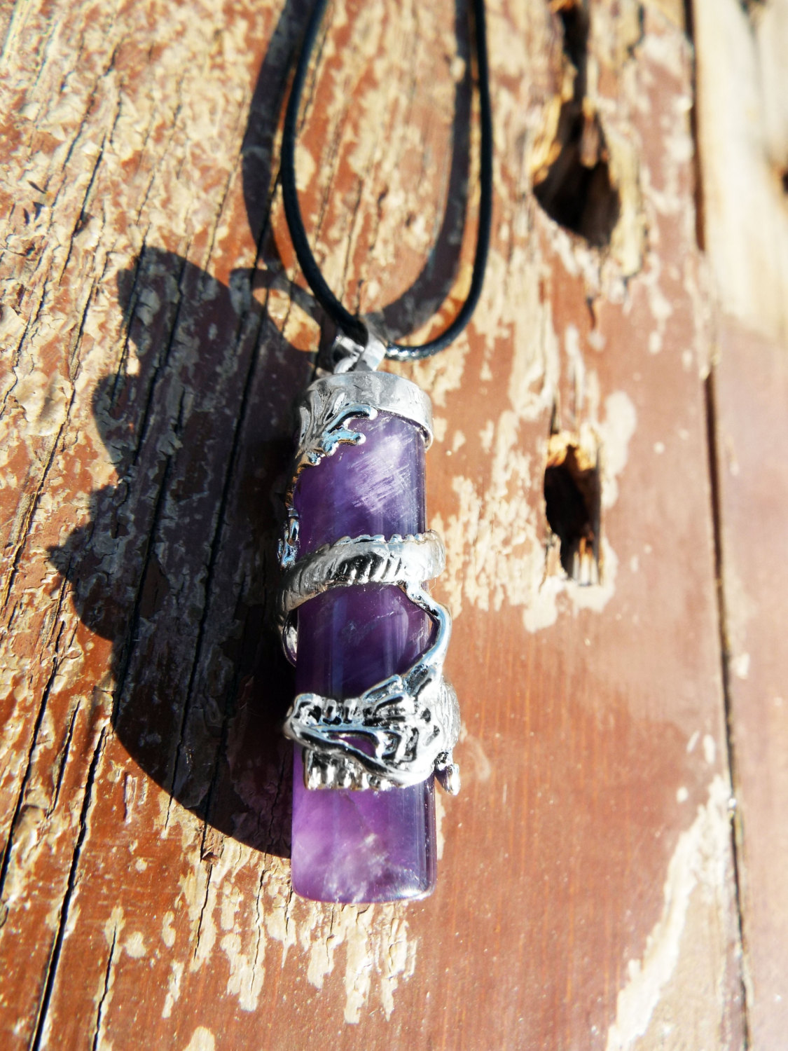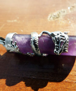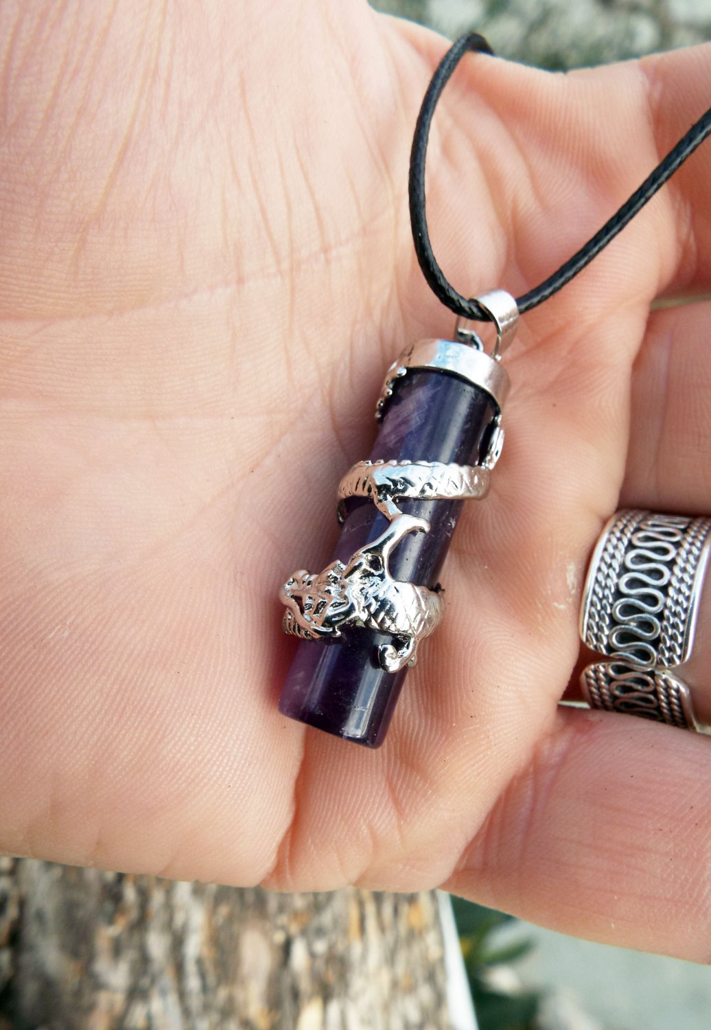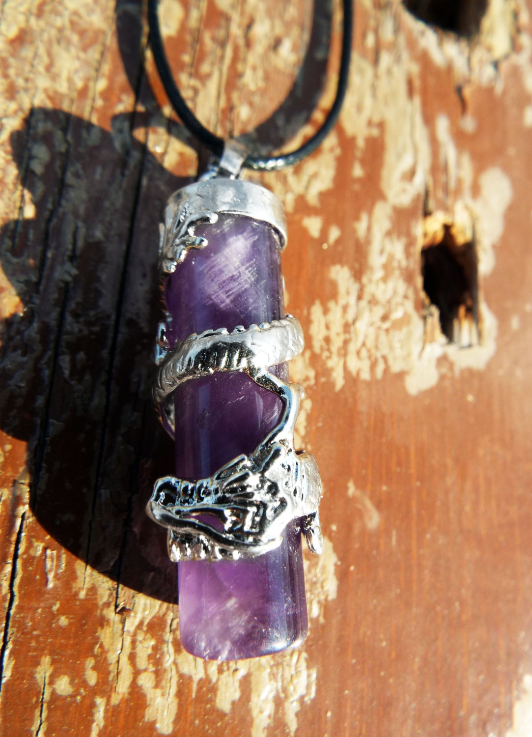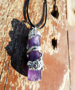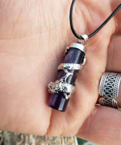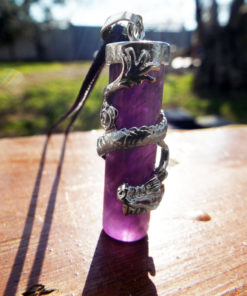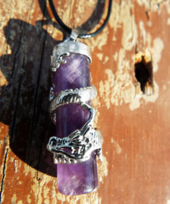 Amethyst Dragon Pendant Gemstone Pendulum Silver Necklace Cylinder Handmade Gothic Magic Dark Wicca Jewelry