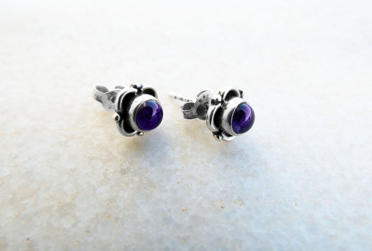 Embrace amethyst's amazing energies with this beautiful pair of studs! They've been handmade with sterling 925 silver and deep purple amethyst. The earrings have an easy sterling silver 'butterfly' fastening. The measurements are as follows: