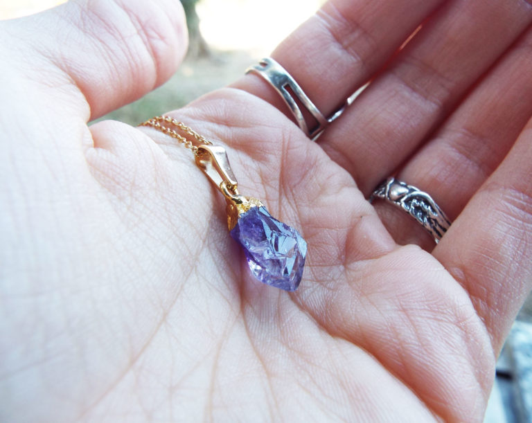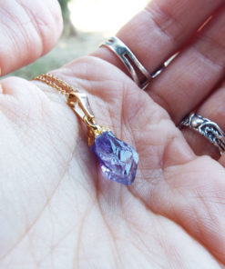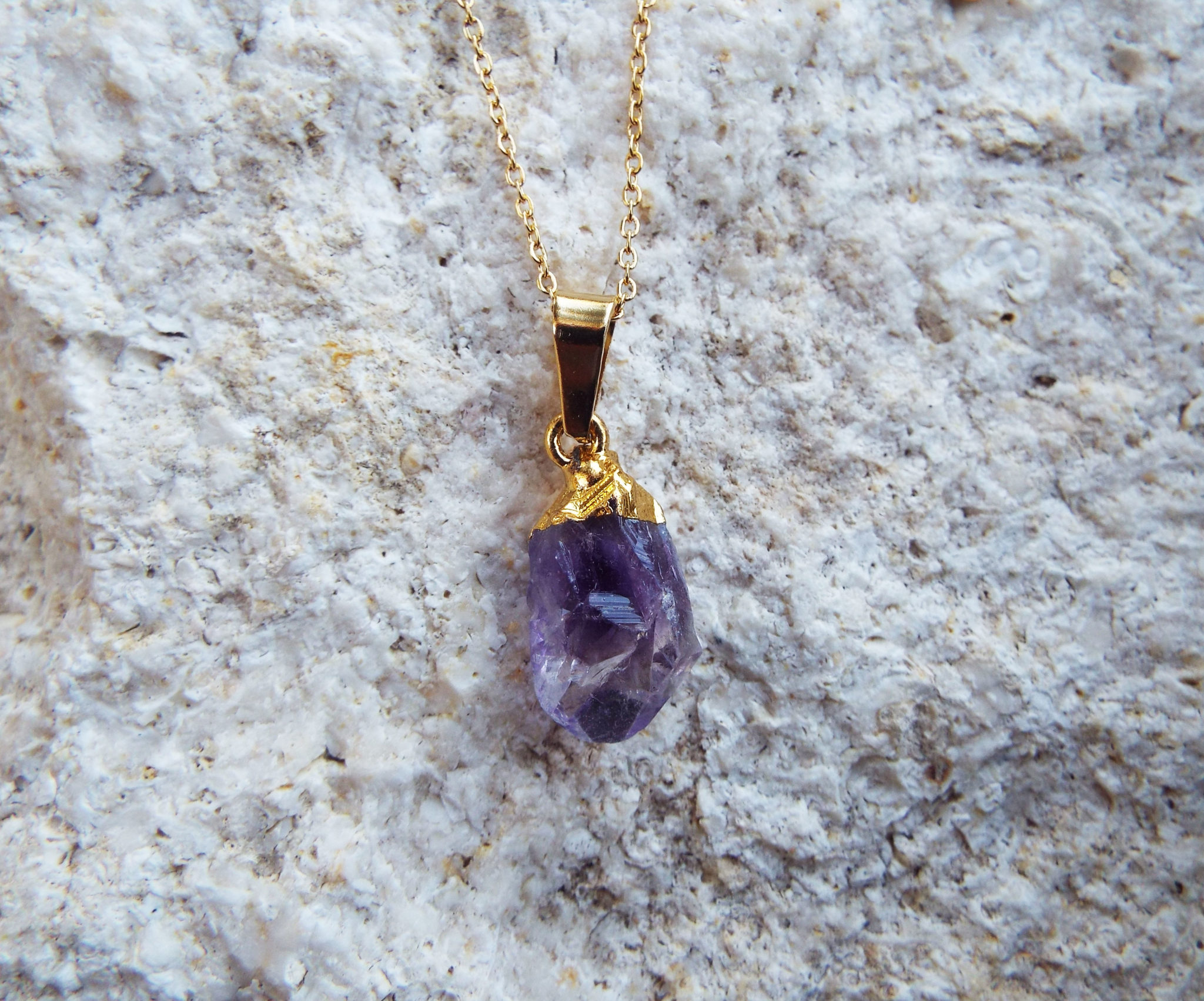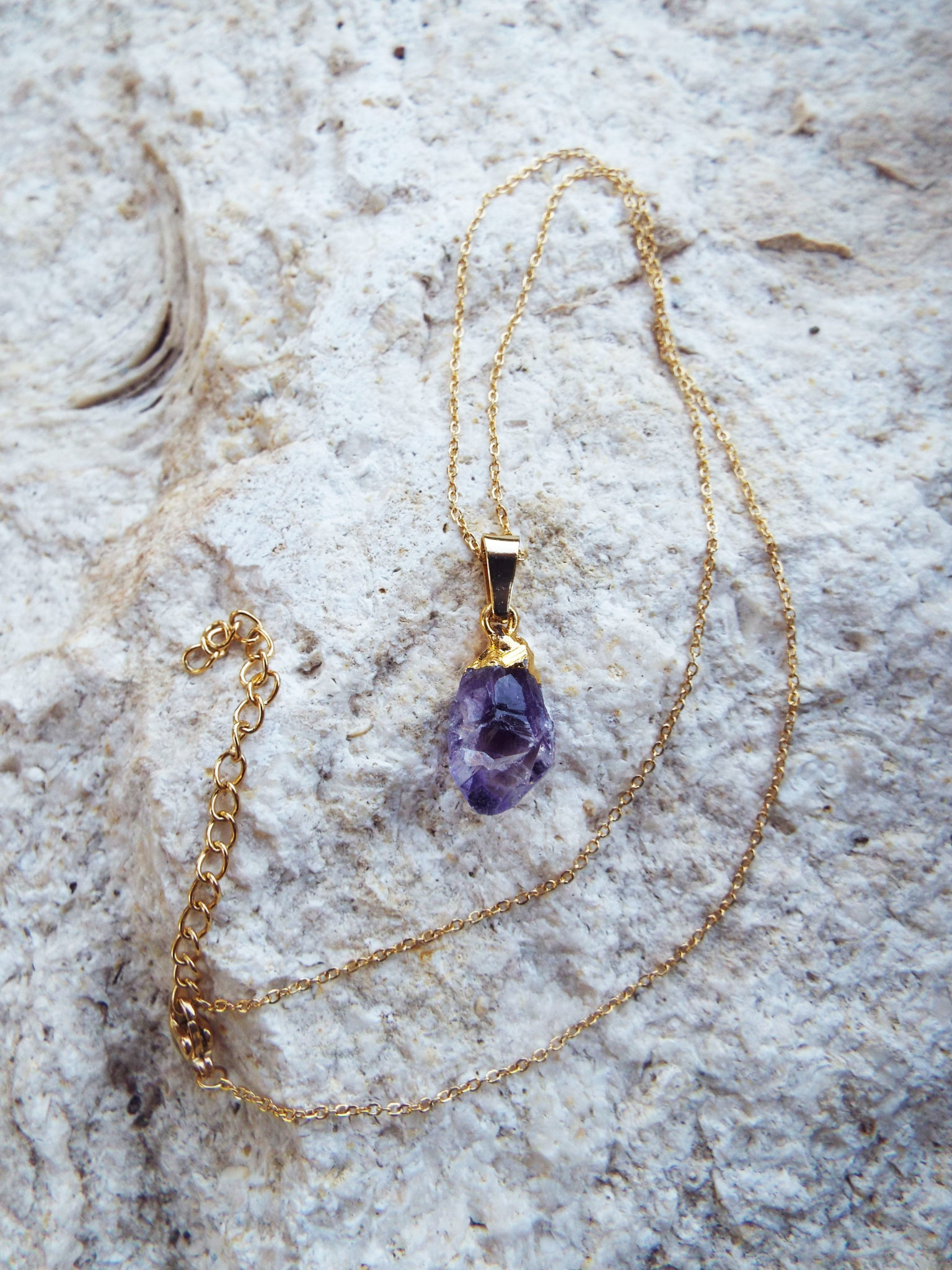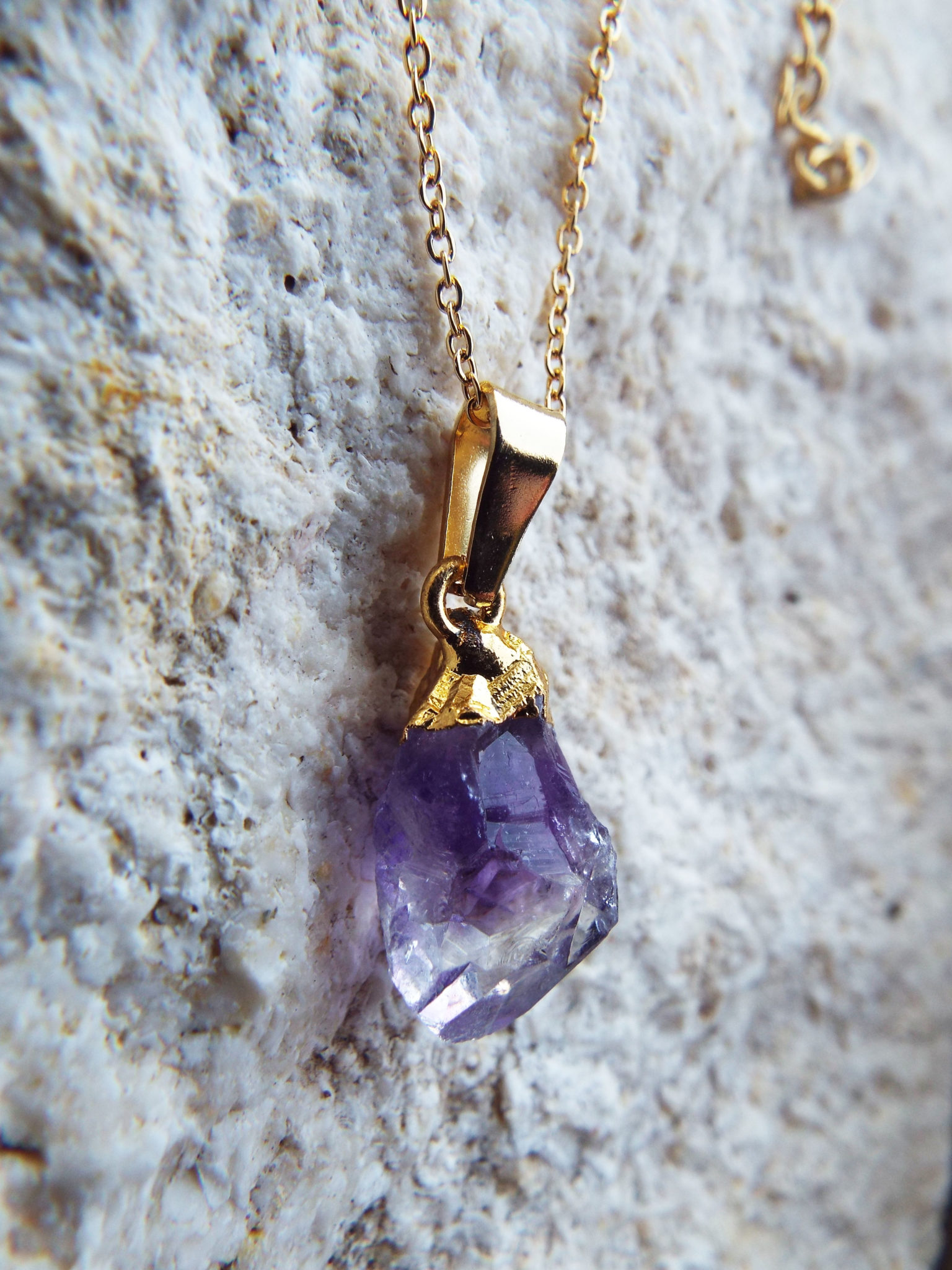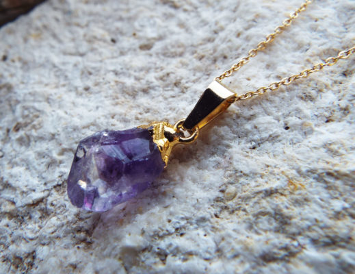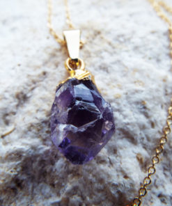 This amazing raw amethyst has been hand crafted into a pendant, wrapped with shiny gold stainless steel. Stainless steel is incredibly strong and is not affected by the elements. (water, air, seawater…etc)