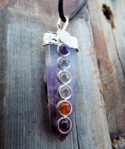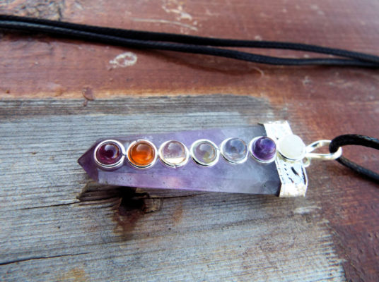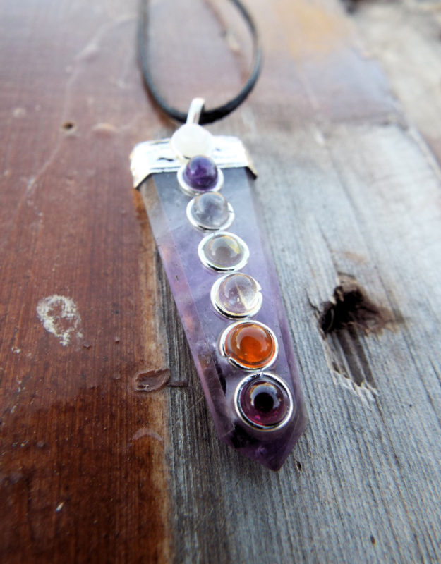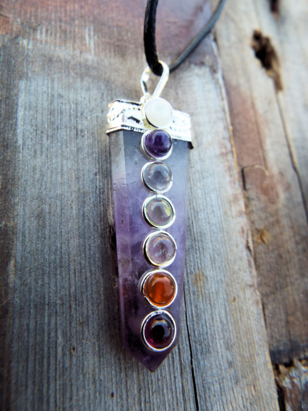 Embrace all seven chakras with this handmade pendulum! The gemstones for each chakra are: Moonstone, amethyst, sodalite, green quartz, clear quartz, carnelian and garnet.