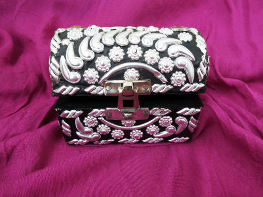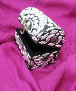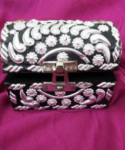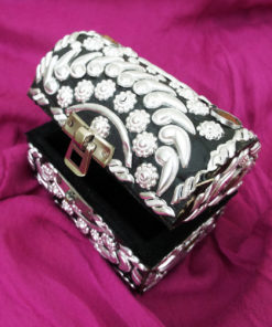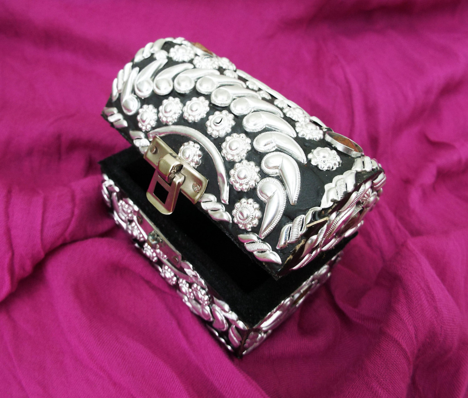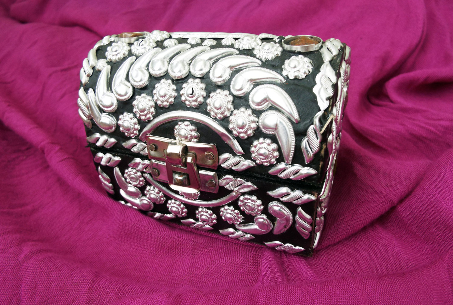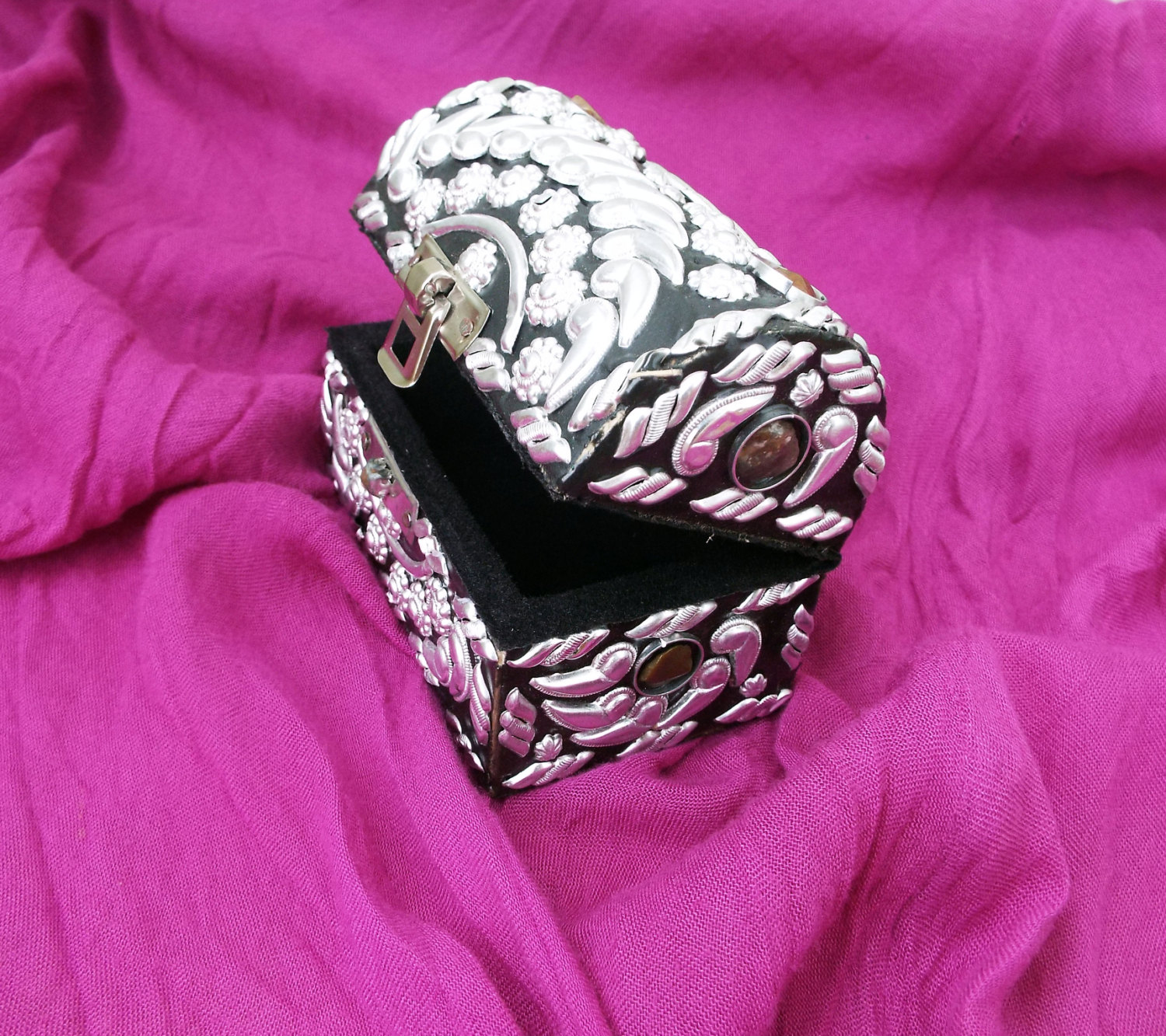 This beautiful handmade box is hand carved and has intricate Indian and Balinese style floral patterns. It is very special and would make a lovely gift for a loved one, as it's perfect for storing personal, special items. The trinket box is especially ideal for pieces of jewelry as there is space to store your favourite pieces. It definitely makes a beautiful addition to one's home decoration, especially if you appreciate handmade metalwork. Much effort and artistic energy has been put into the making of this piece and its positive energies will surely be passed on to the new owner. The box is coated inside with midnight black velvet for an elegant touch, but also to protect your personal items from the hard Alpaca Silver.