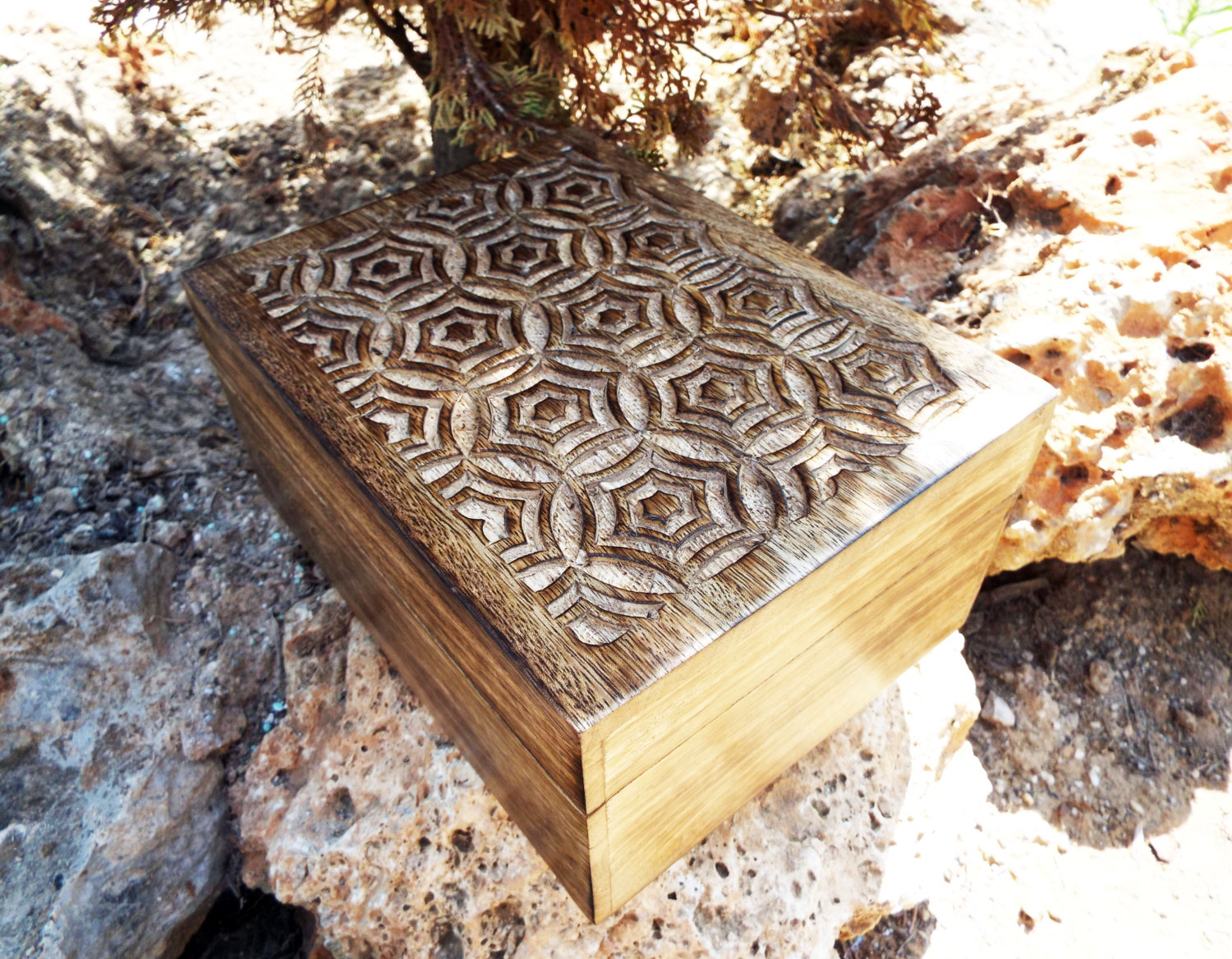 This beautiful handmade box is hand carved and has intricate floral-hexagon patterns.