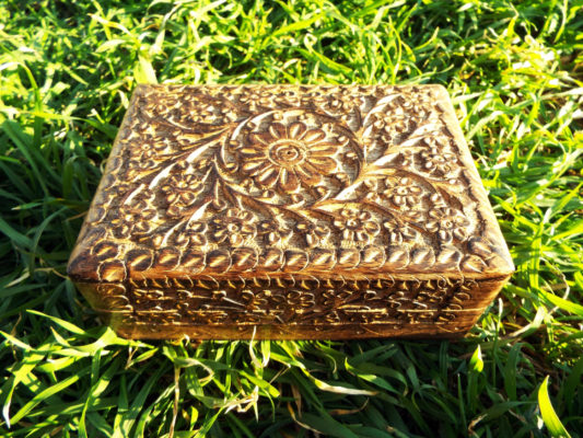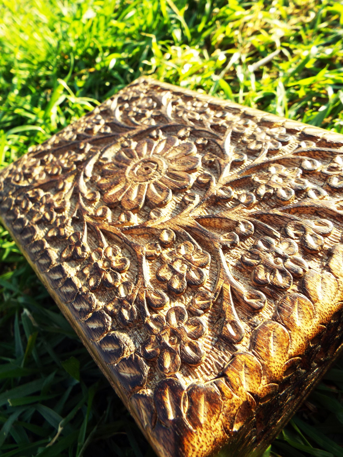This beautiful handmade box is hand carved and has an intricate flower design.