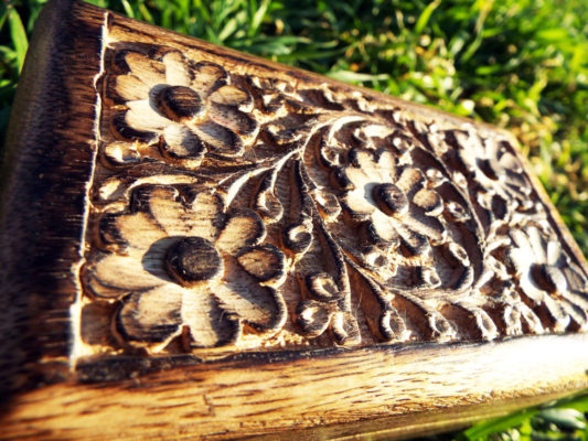 This beautiful handmade box is hand carved and has an intricate flower design.