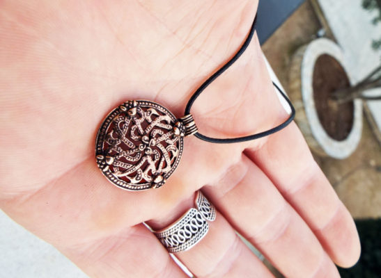 The pendant will be sent with an adjustable black cotton strap, but it also looks great with any metal chain (silver, gold, bronze…etc).