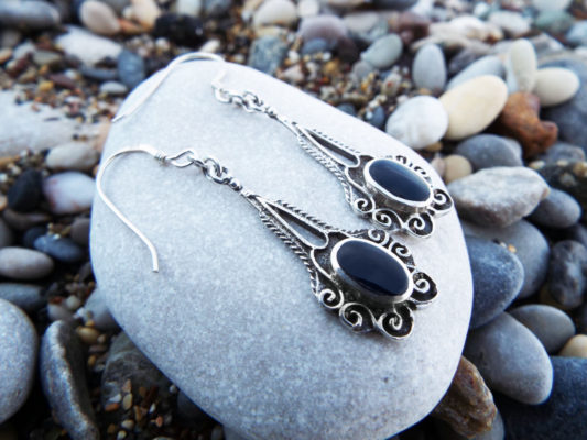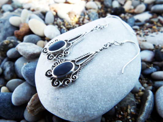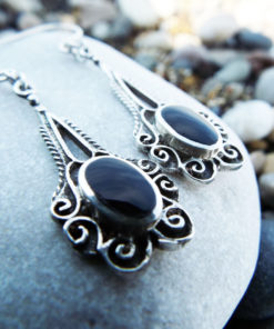 Embrace onyx’s amazing energies with this handmade pair of dangle-earrings. They’re made of sterling 925 silver which has been crafted into swirls and coils, creating an antique, gothic style. The measurements are as follows: