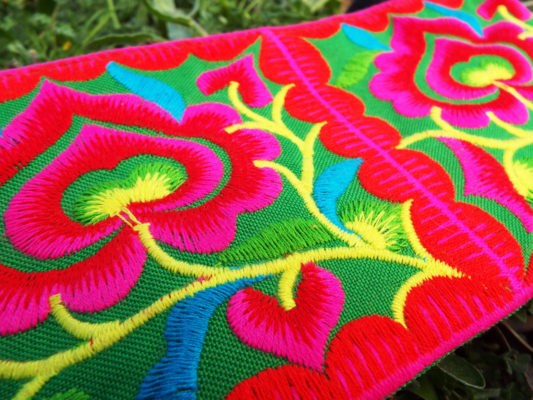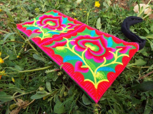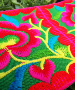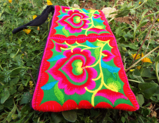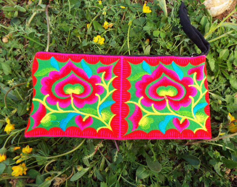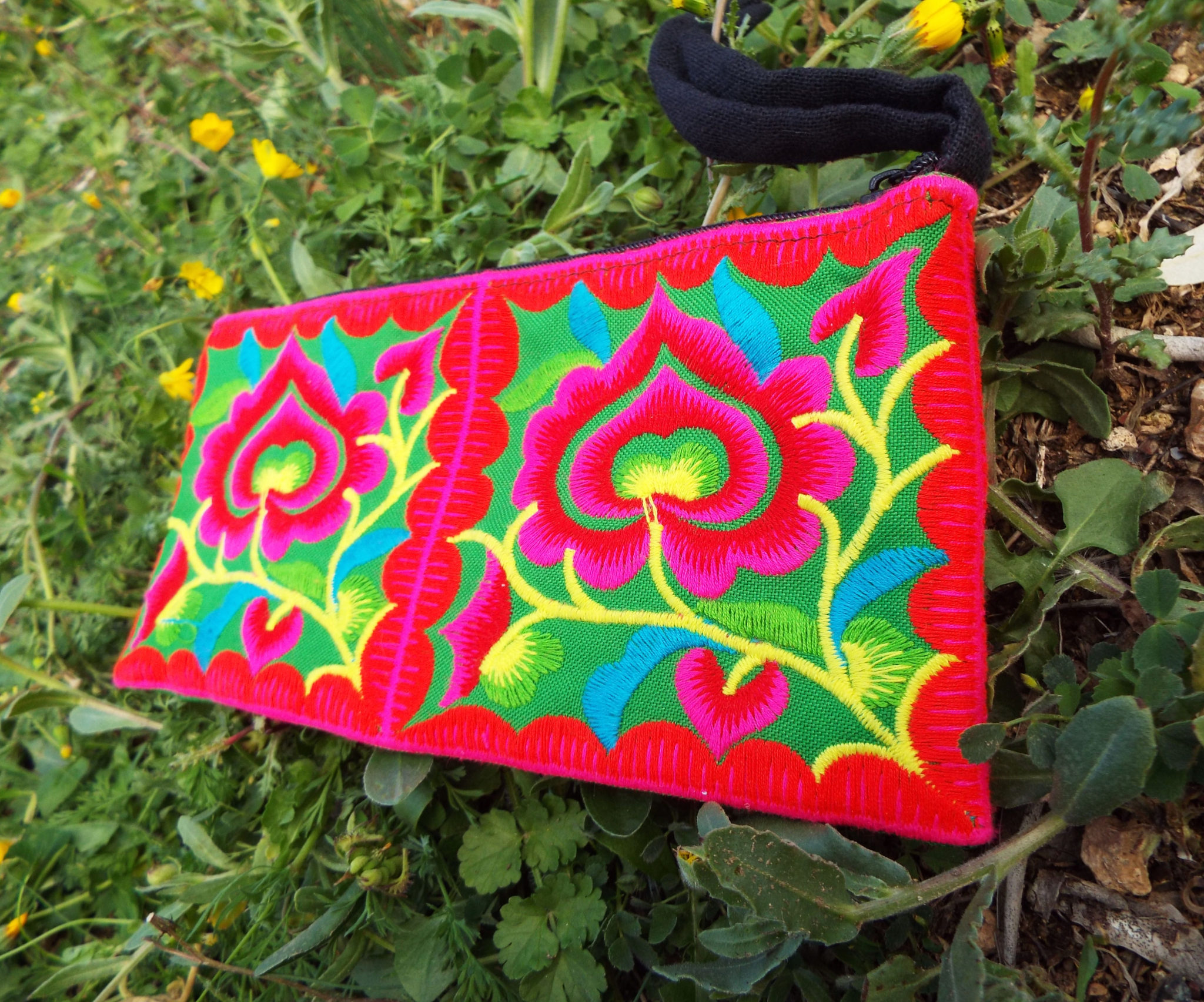 This is a hand stitched pure cotton purse/wallet with bright shades pink, red and green. It has a relaxed, bohemian style!