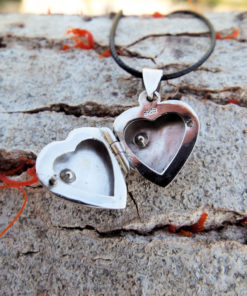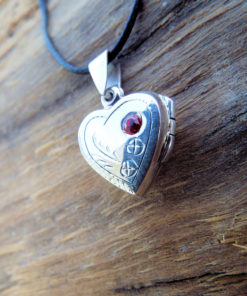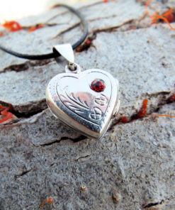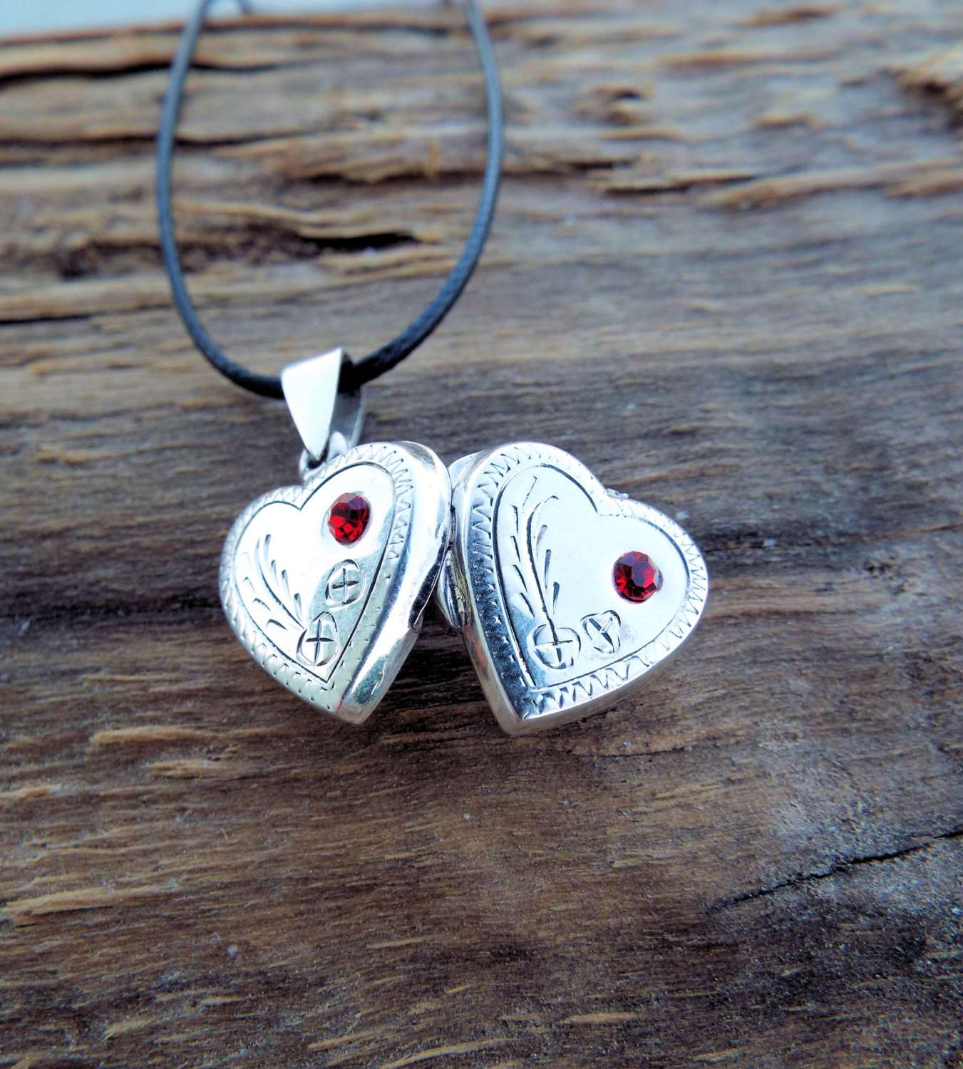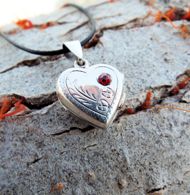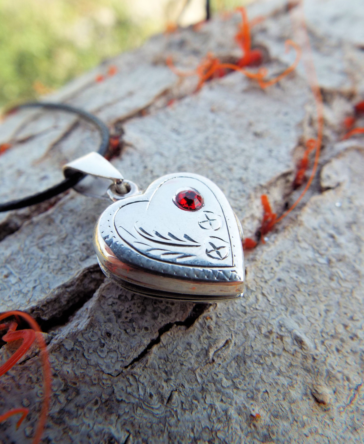 Declare your love with this beautiful handmade heart locket! It's made of sterling 925 silver and has filigree hand carved patterns in the centre along with a glistening ruby red stone. This would make the perfect gift for your loved one. Also, it's perfect for storing memorable photographs and small treasures.The measurements are as follows: