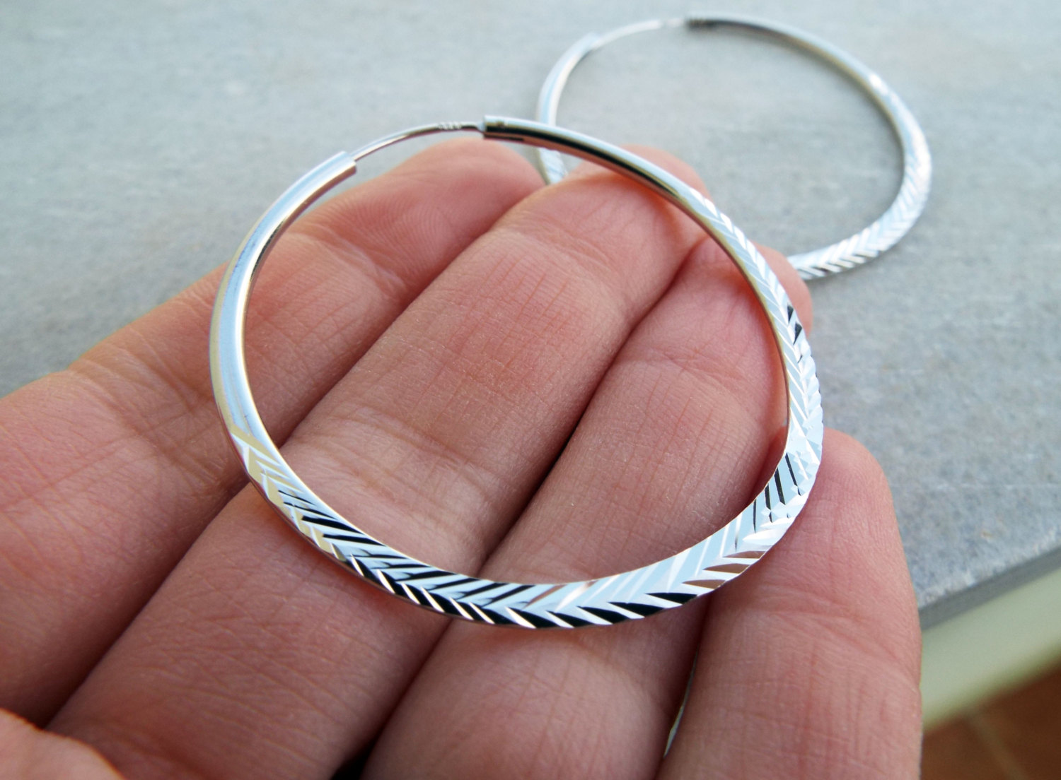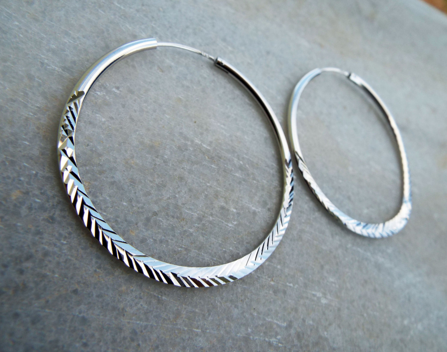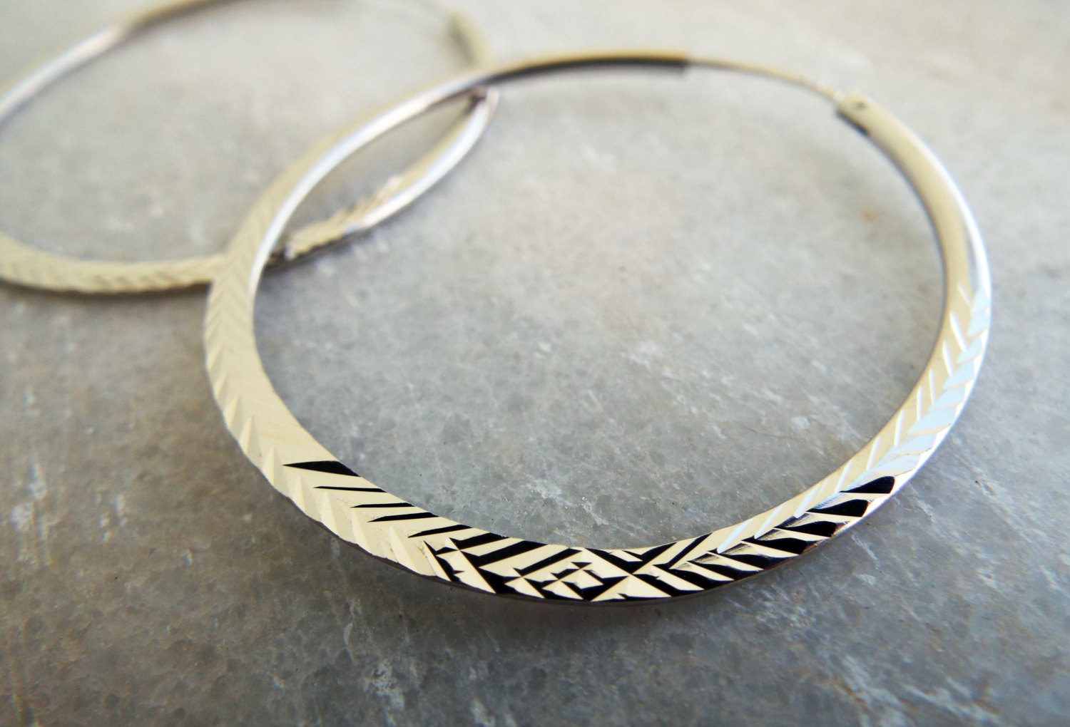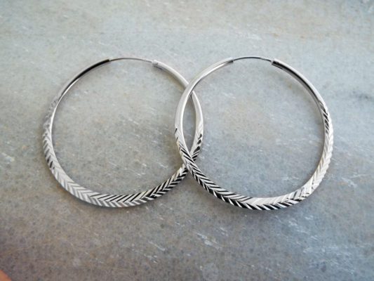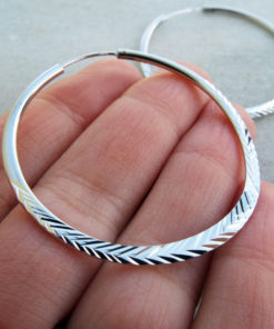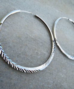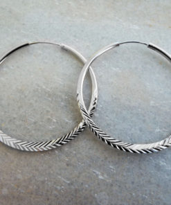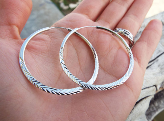 These traditional hoops have been handmade using sterling 925 silver, and depict a Balinese classic design which dates back to centuries of existence. The traditional silver work creates an authentic, tribal pair of earrings which can be worn on every occasion. The hoops measure: