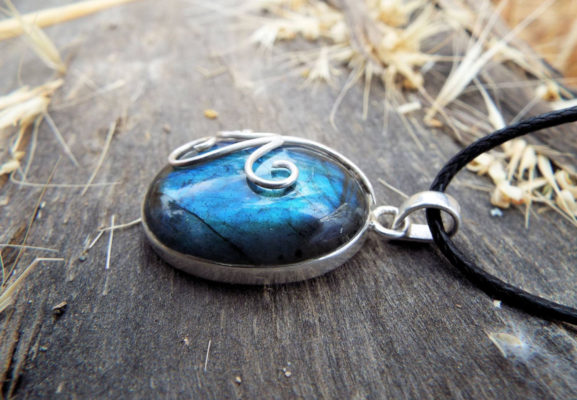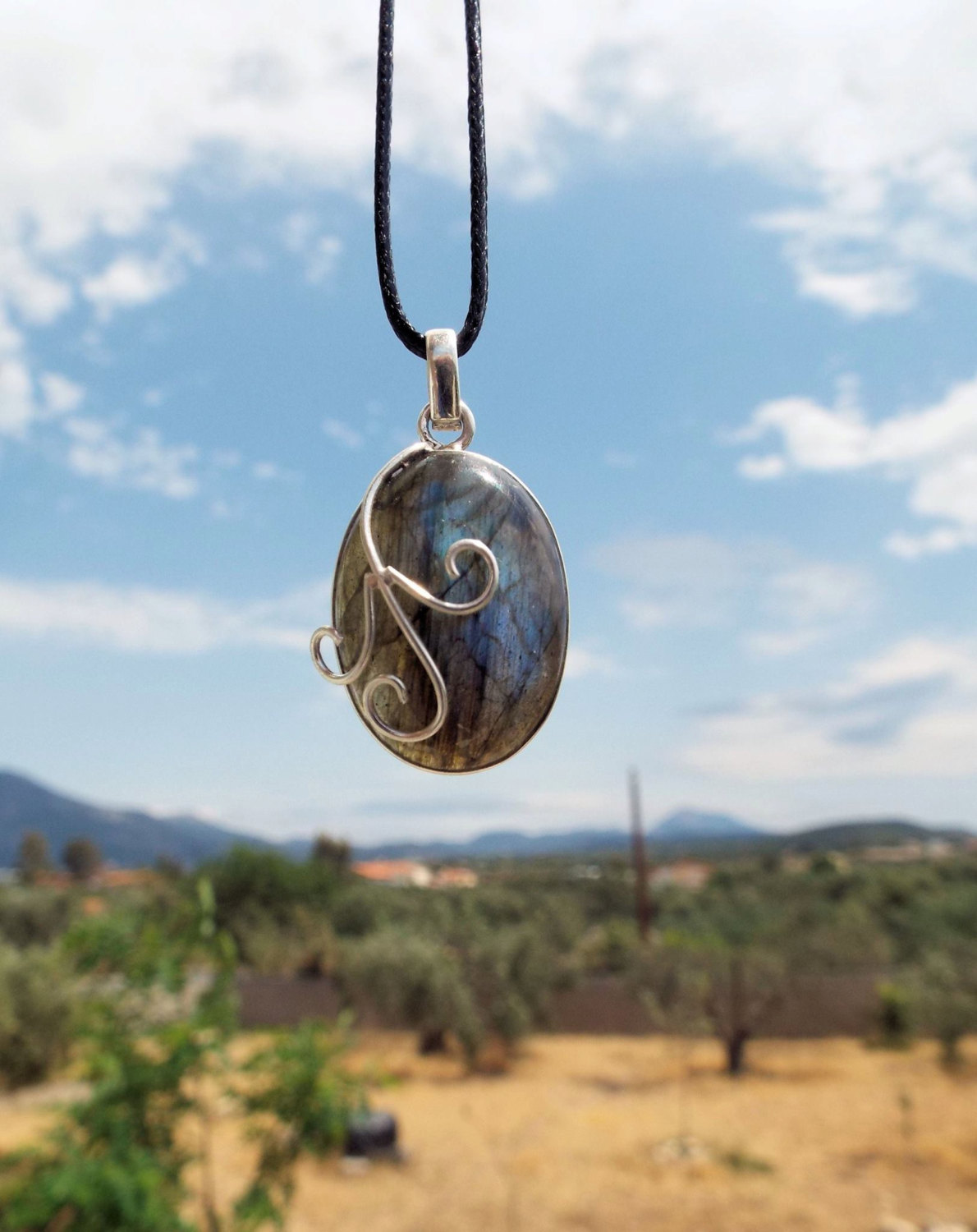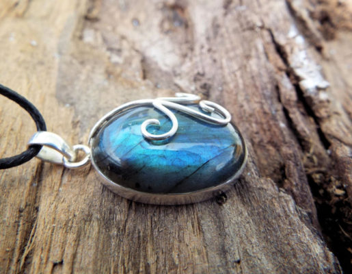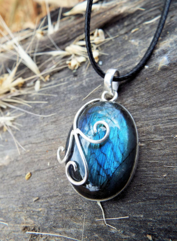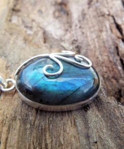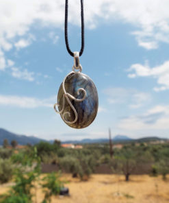 Embrace the magic of the labradorite with this handmade piece! It’s made of sterling 925 silver which has been crafted into graceful swirls to hold the brilliant ocean-like stone.