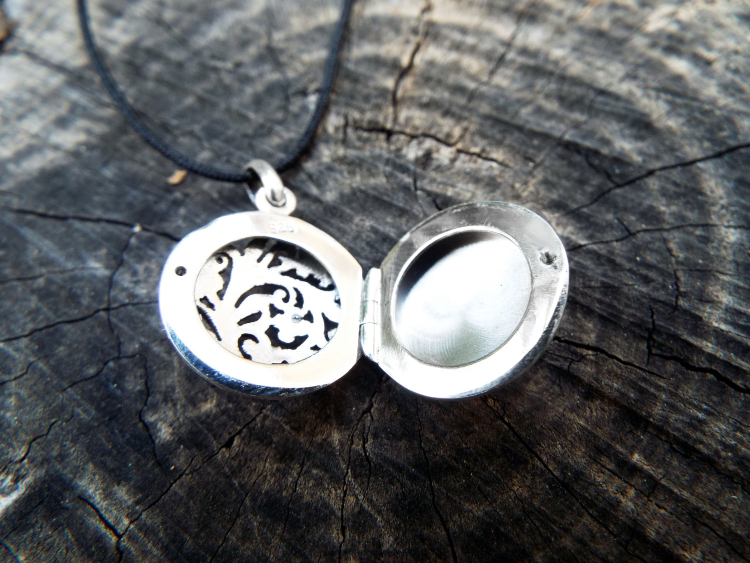 This handmade pendant is made of sterling 925 silver and has a vintage/antique style. The filigree floral patterns are see-through, making it possible for one to see the hidden memory kept locked inside. The measurements are as follows: