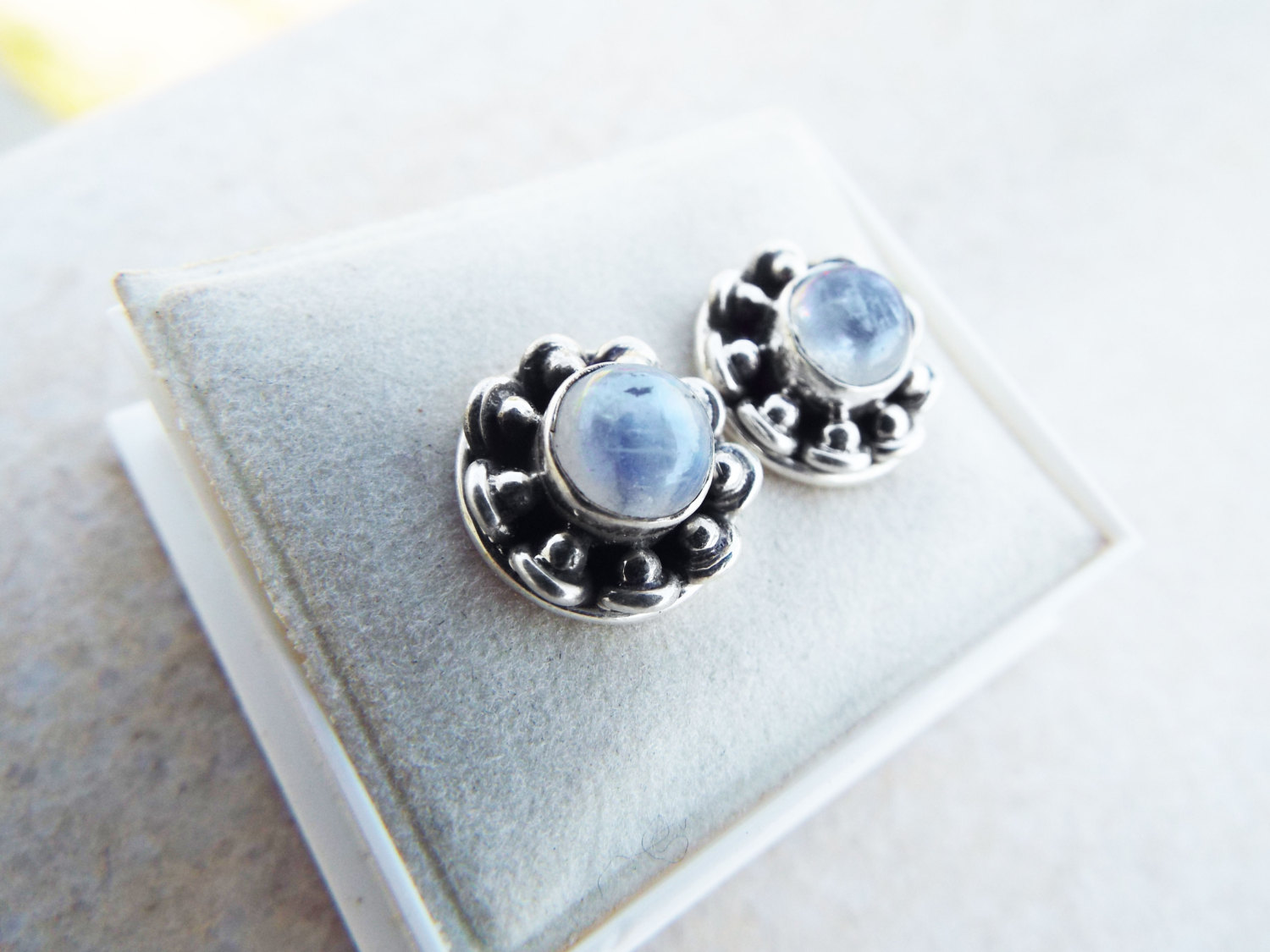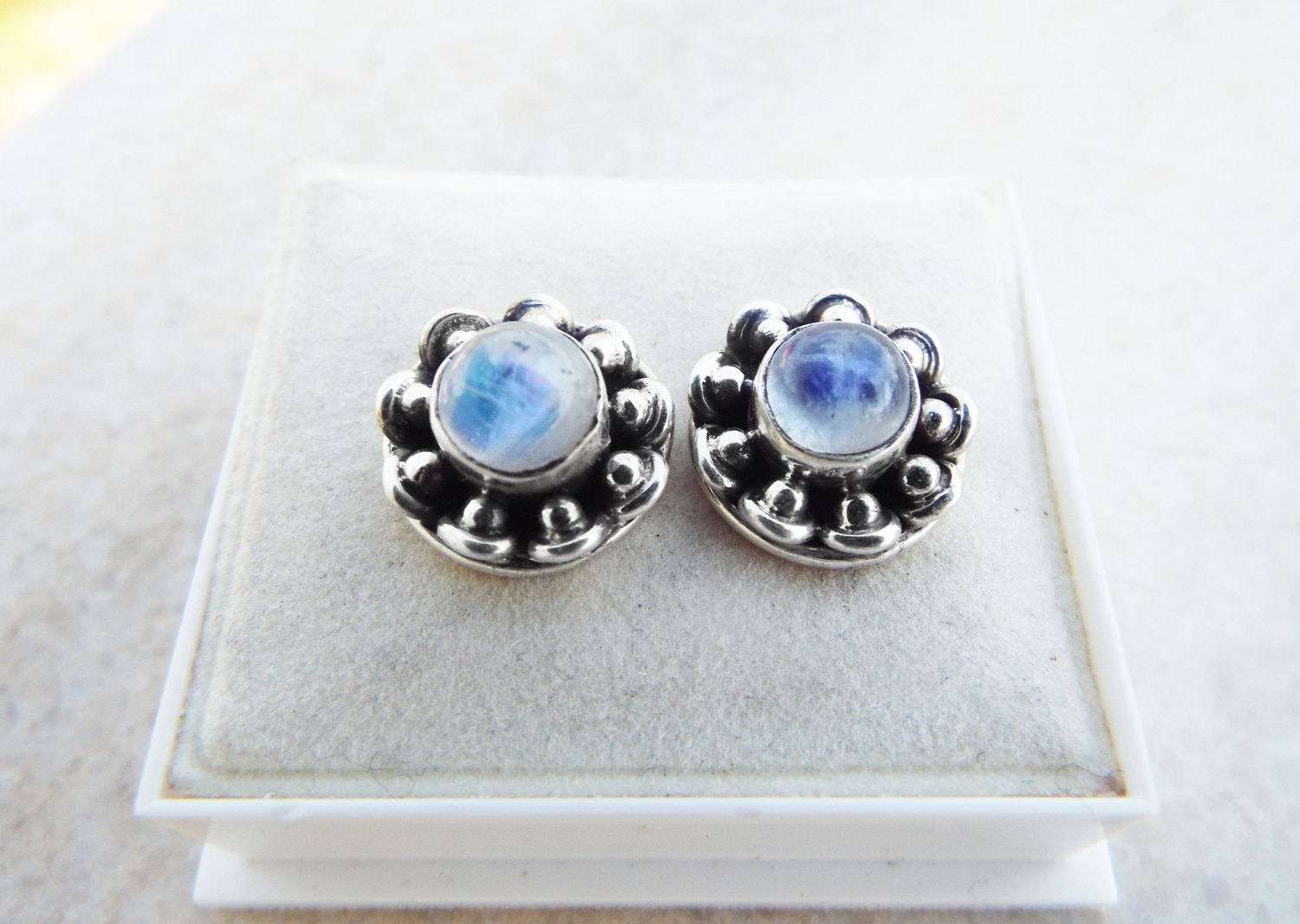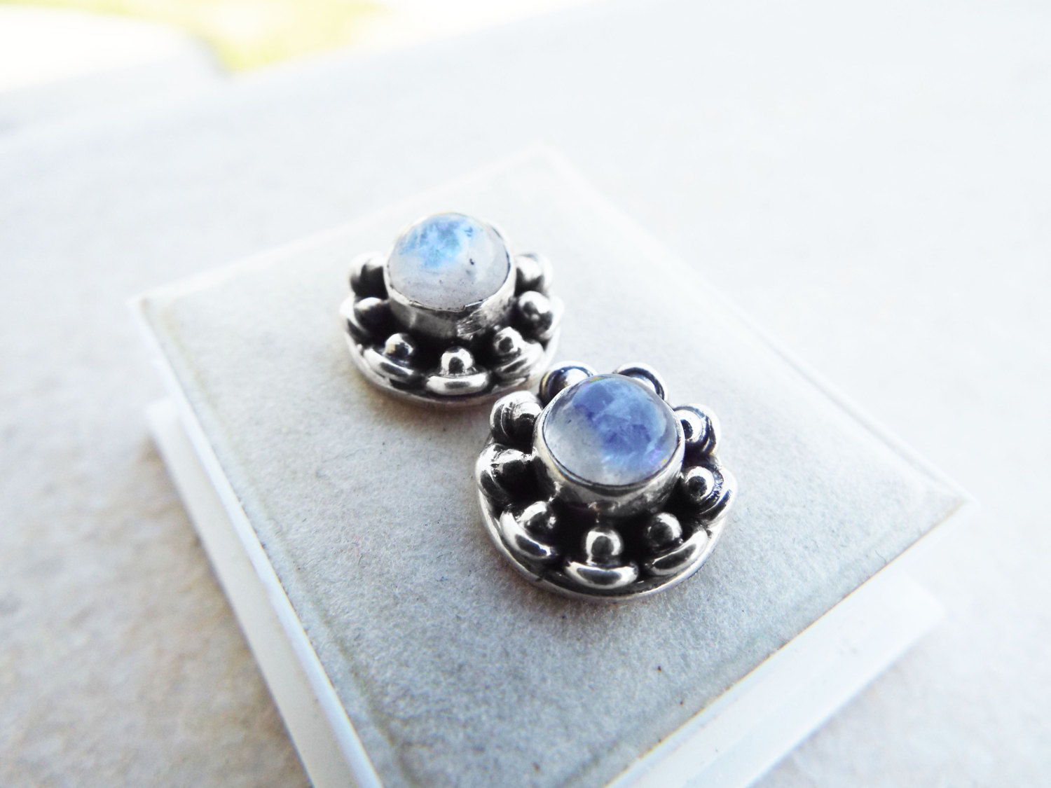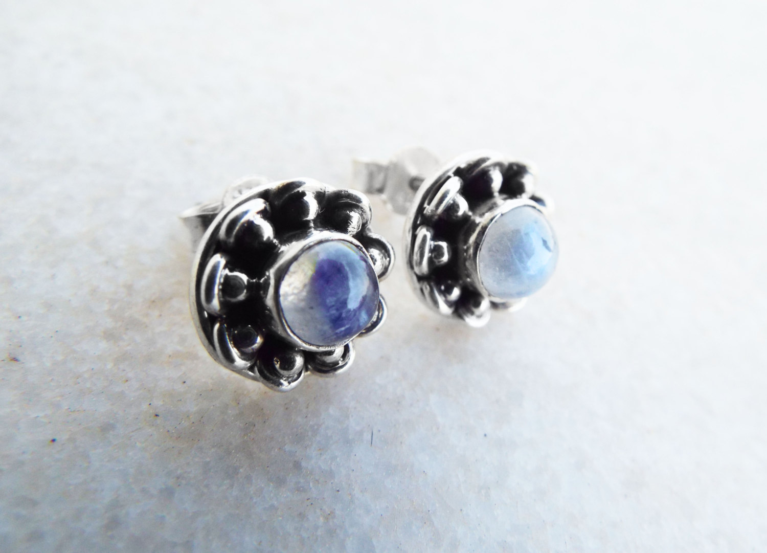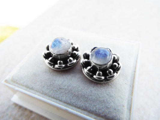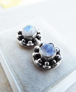 Embrace moonstone’s magical energies with this handmade pair of studs! They’ve been handmade with sterling 925 silver and brilliant moonstone. The earrings have an easy sterling silver ‘butterfly’ fastening. The measurements are as follows: