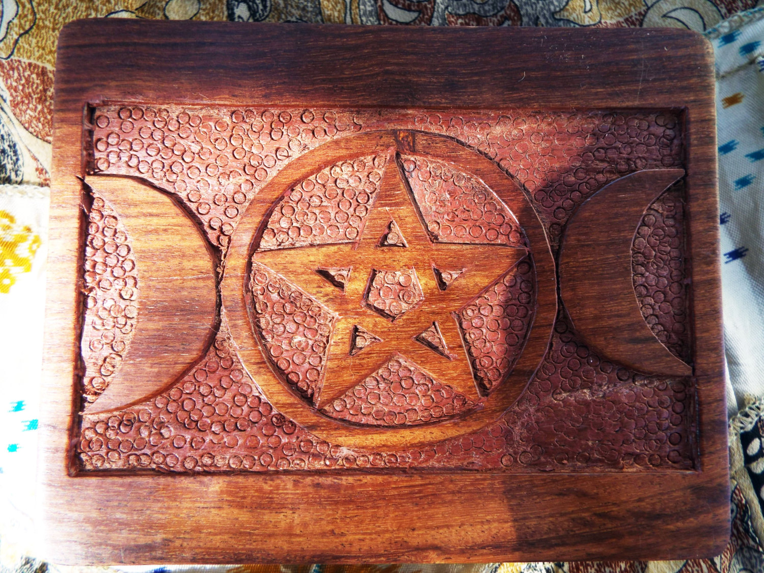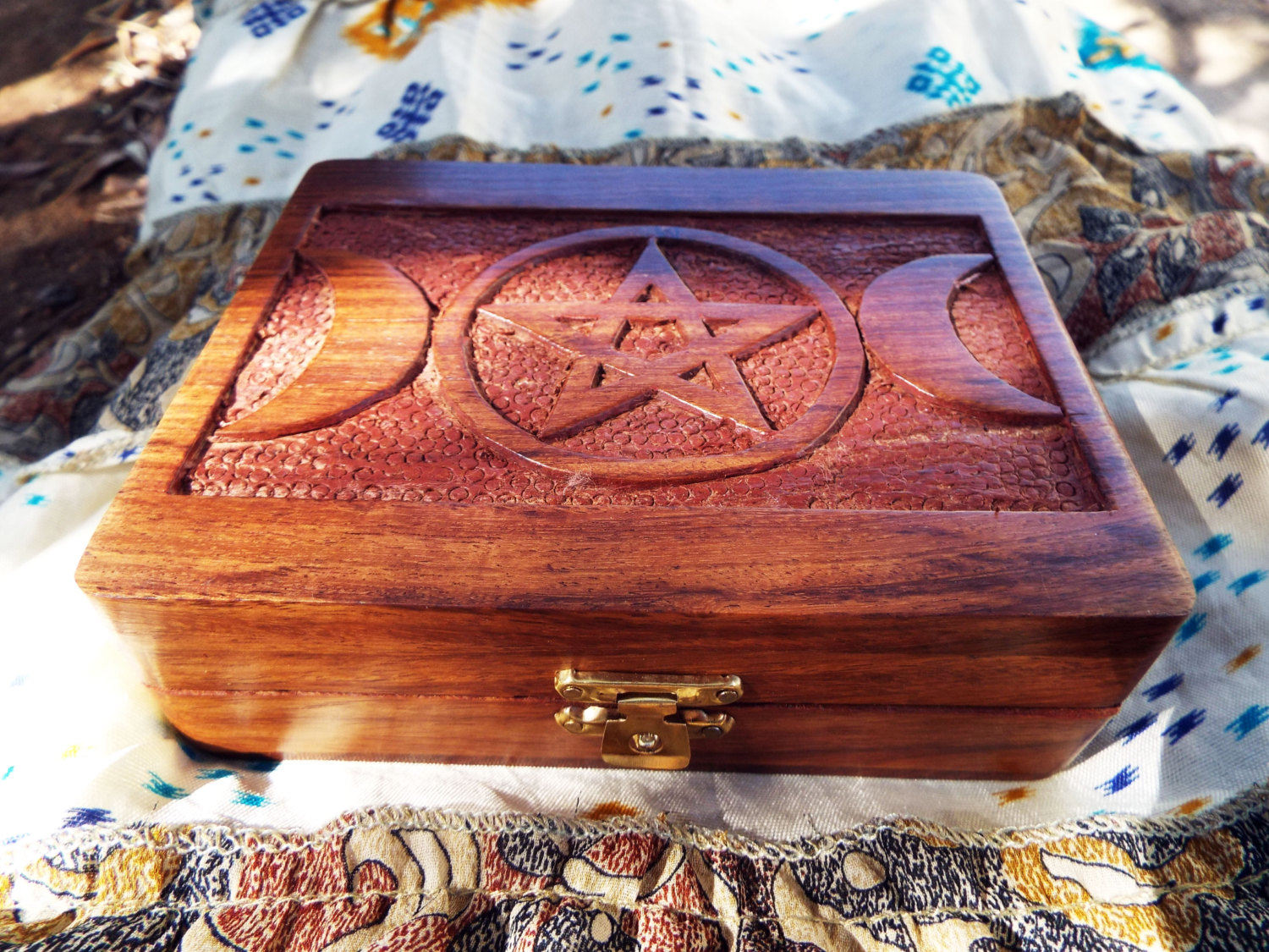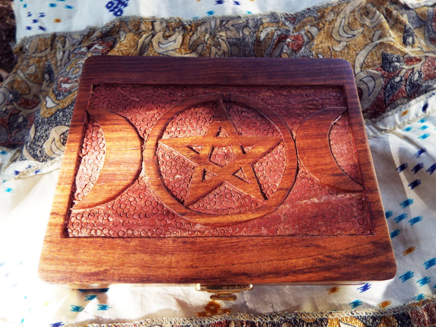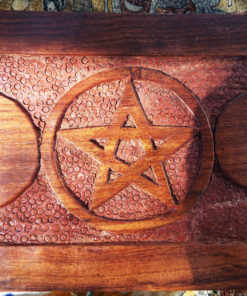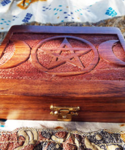 The circled pentagram symbolises eternity and infinity, the cycles of life and nature.This beautiful handmade box is hand carved and has intricate patterns surrounding a circled pentagram. It is very special and would make a lovely gift for a loved one, as it’s perfect for storing personal, special items. The trinket box is especially ideal for pieces of jewelry as there is space to store your favourite pieces. It definitely makes a beautiful addition to one’s home decoration, particularly if you appreciate handmade woodwork. Much effort and artistic energy has been put into the making of this piece and its positive energies will surely be passed on to the new owner. The measurements are as follows: