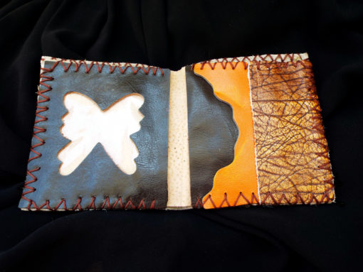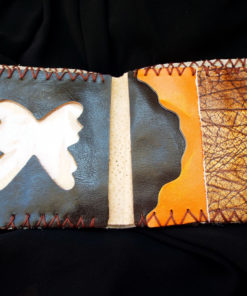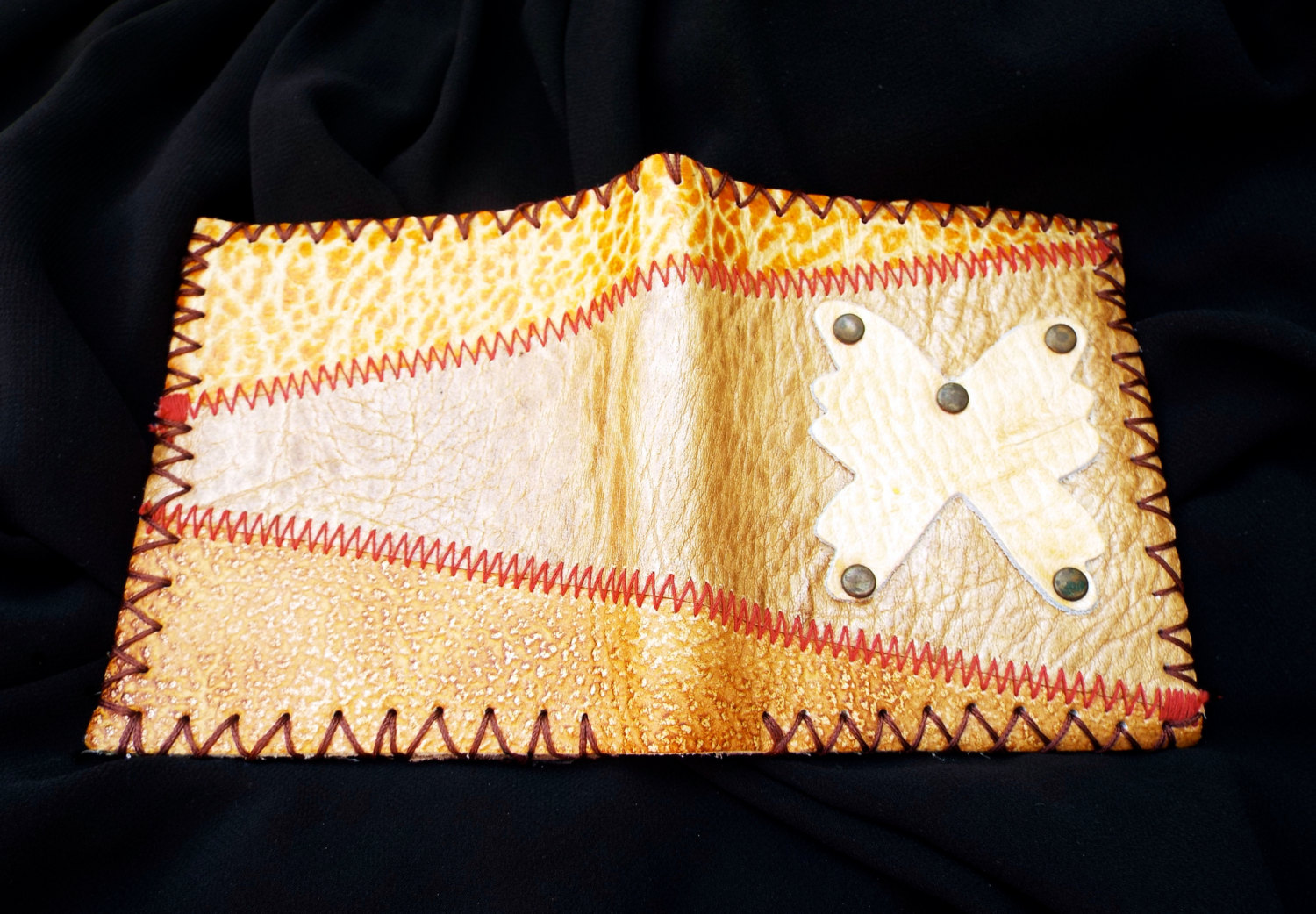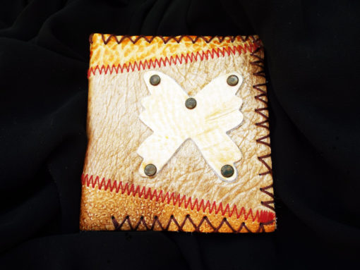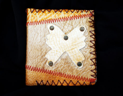 This is a hand stitched real leather purse/wallet with beautiful shades of bronze, red, auburn and orange. An earthy butterfly has been secured on the front with dark bronze studs.