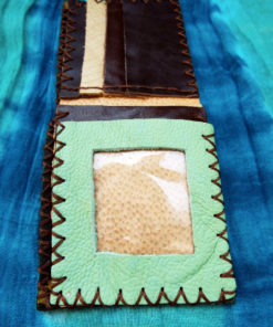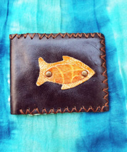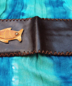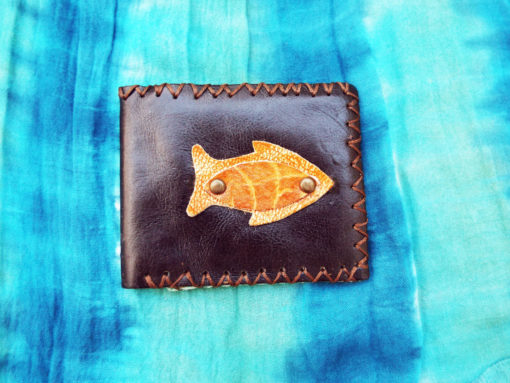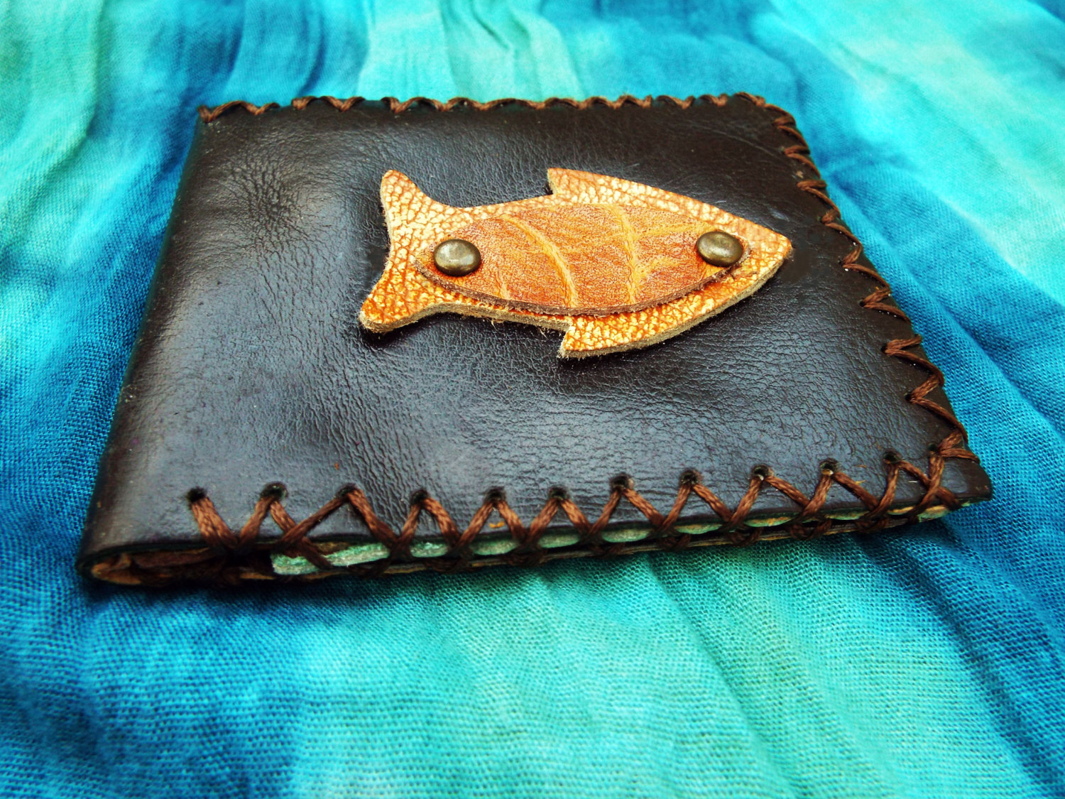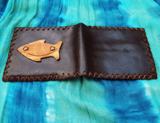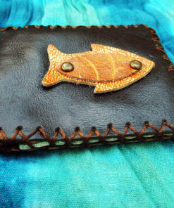 This is a hand stitched real leather purse/wallet with beautiful shades of bronze, turquoise, auburn and black. An golden/auburn fish has been secured on the front with dark bronze studs.
