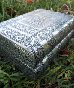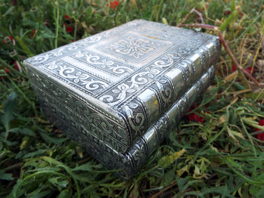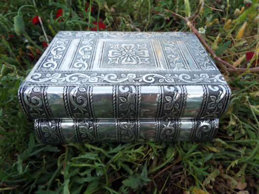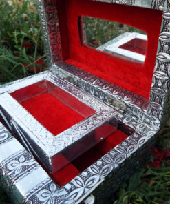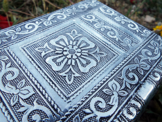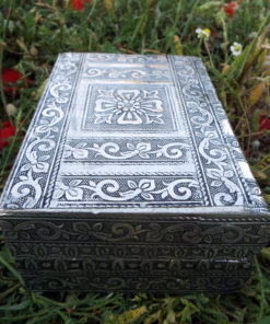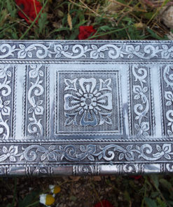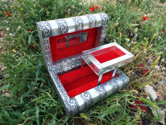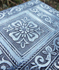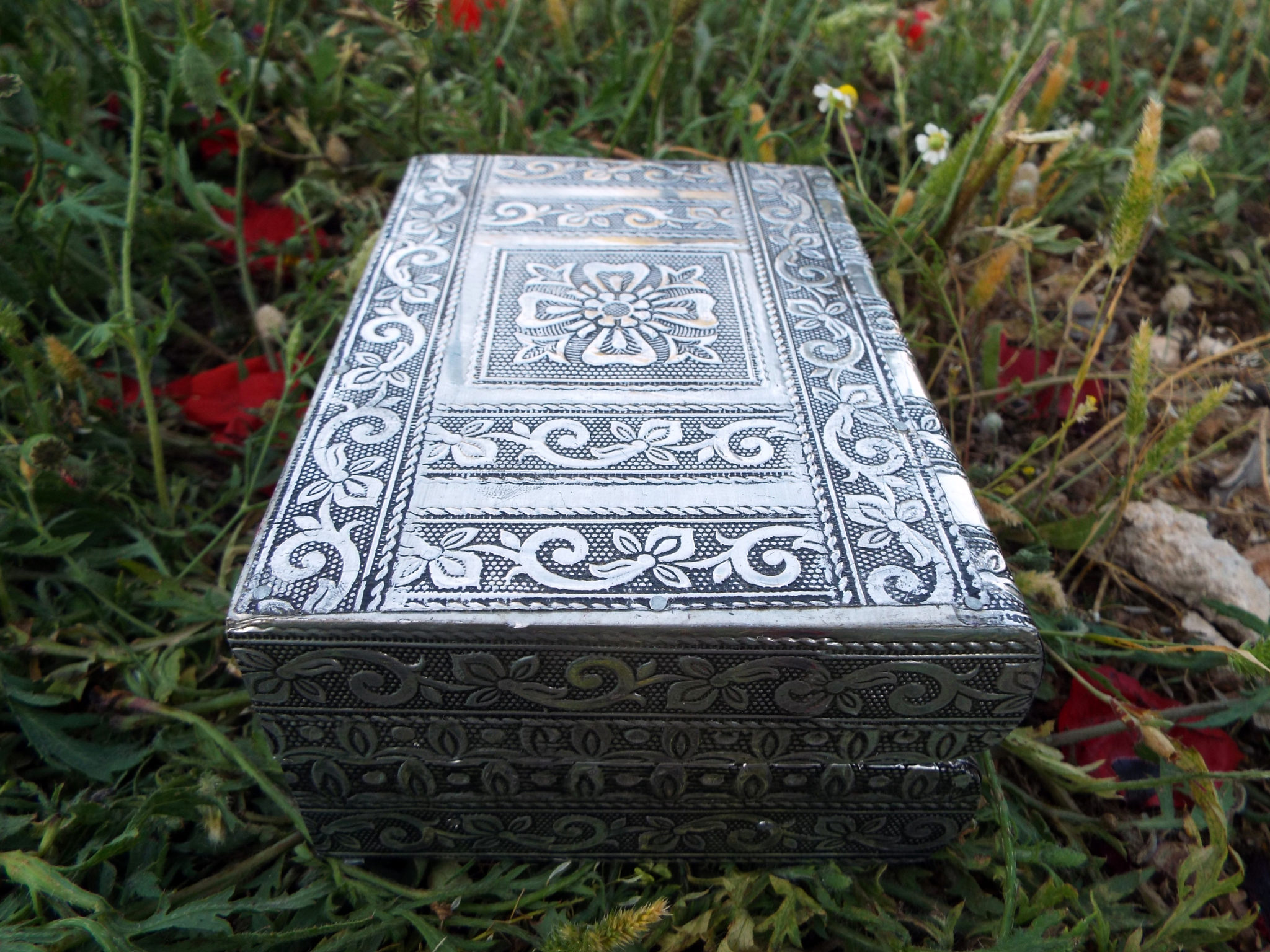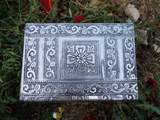 Embrace your own flower-power with this handmade box! It’s made from silver aluminum and has been lined with velvet.