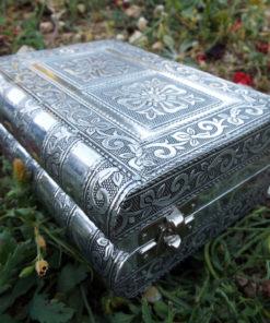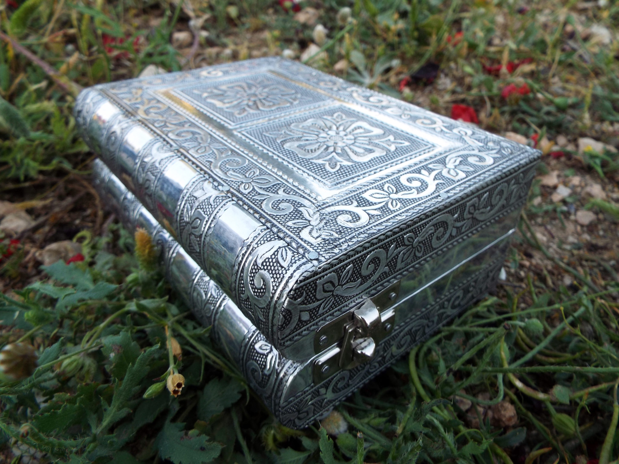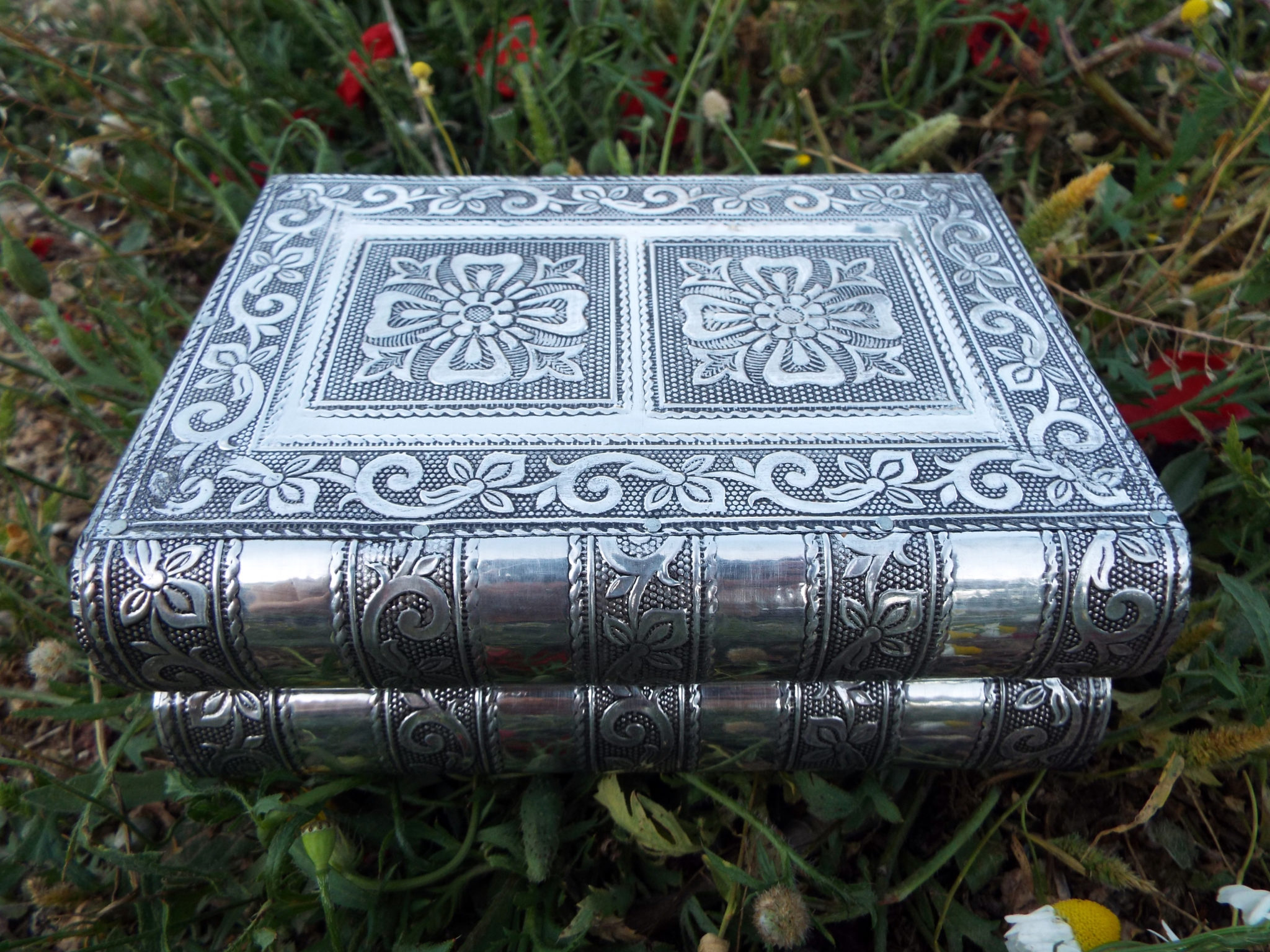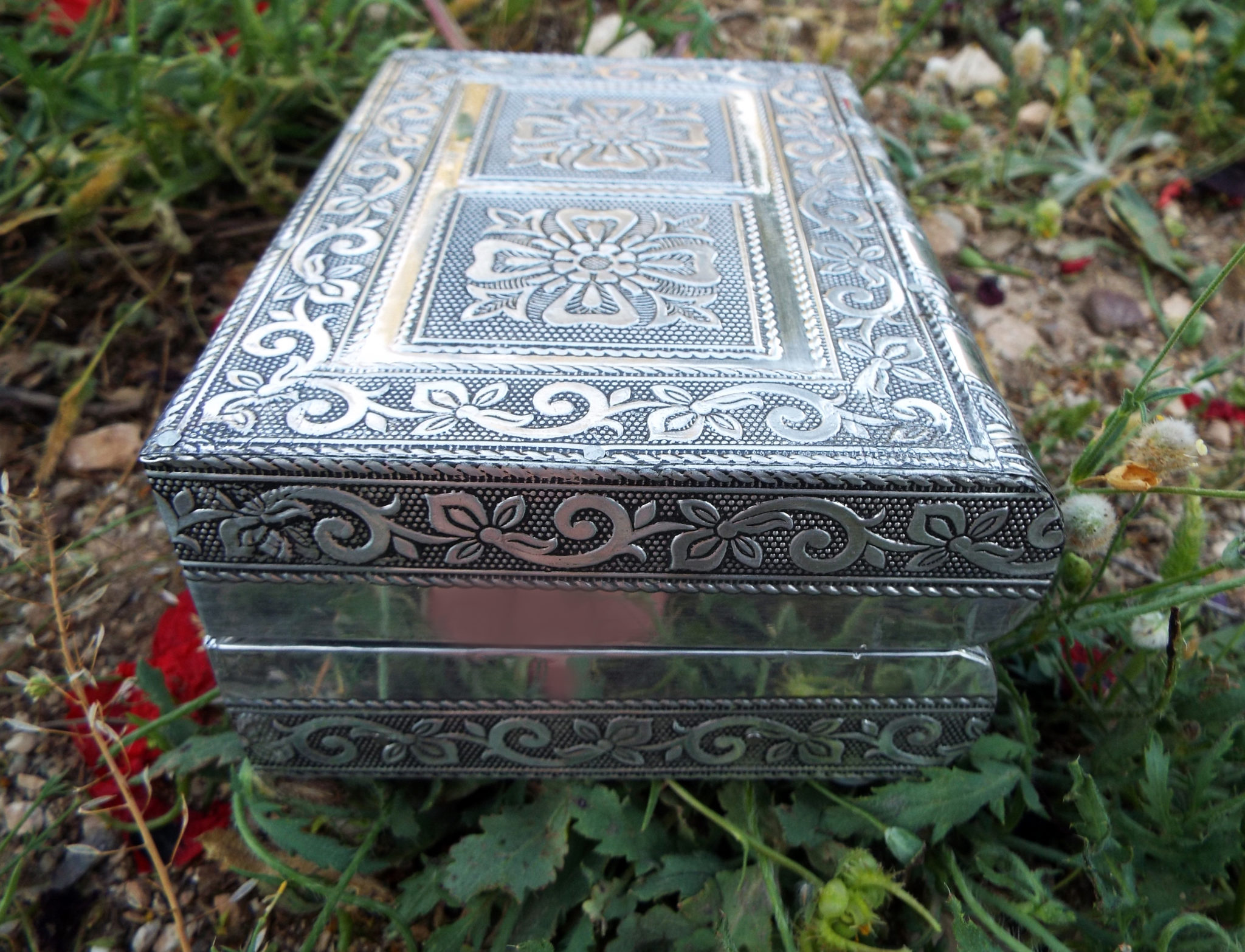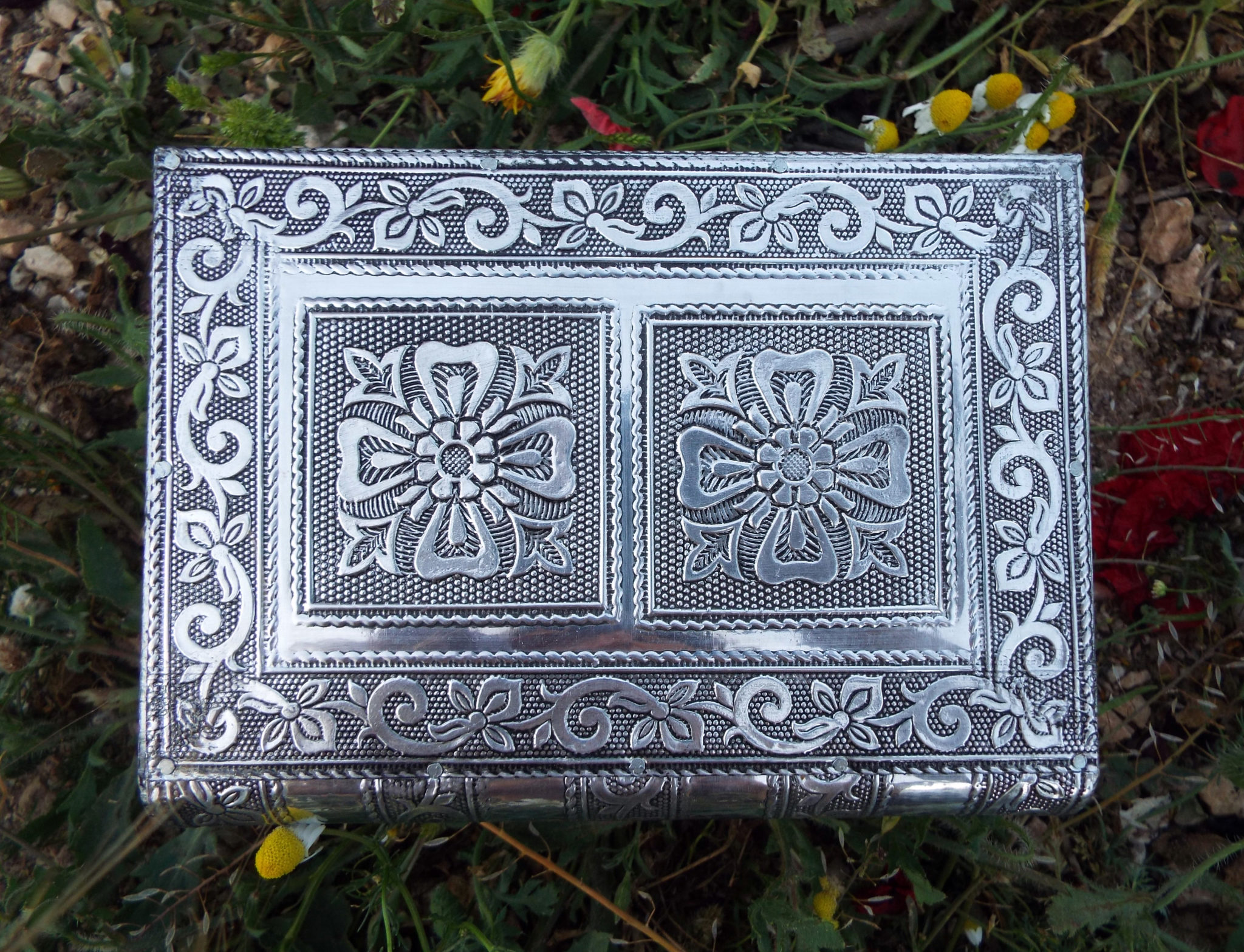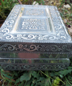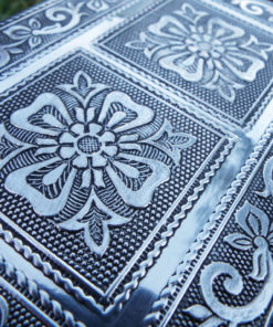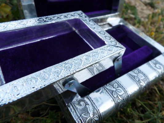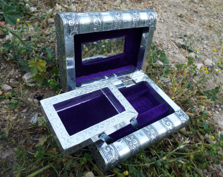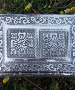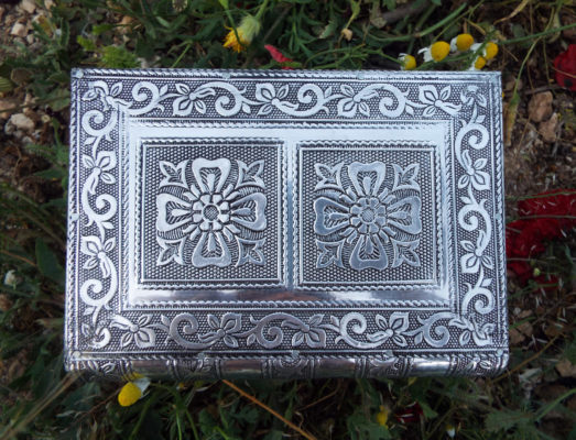 Embrace your own flower-power with this handmade box! It’s made from silver aluminum and has been lined with deep purple velvet.