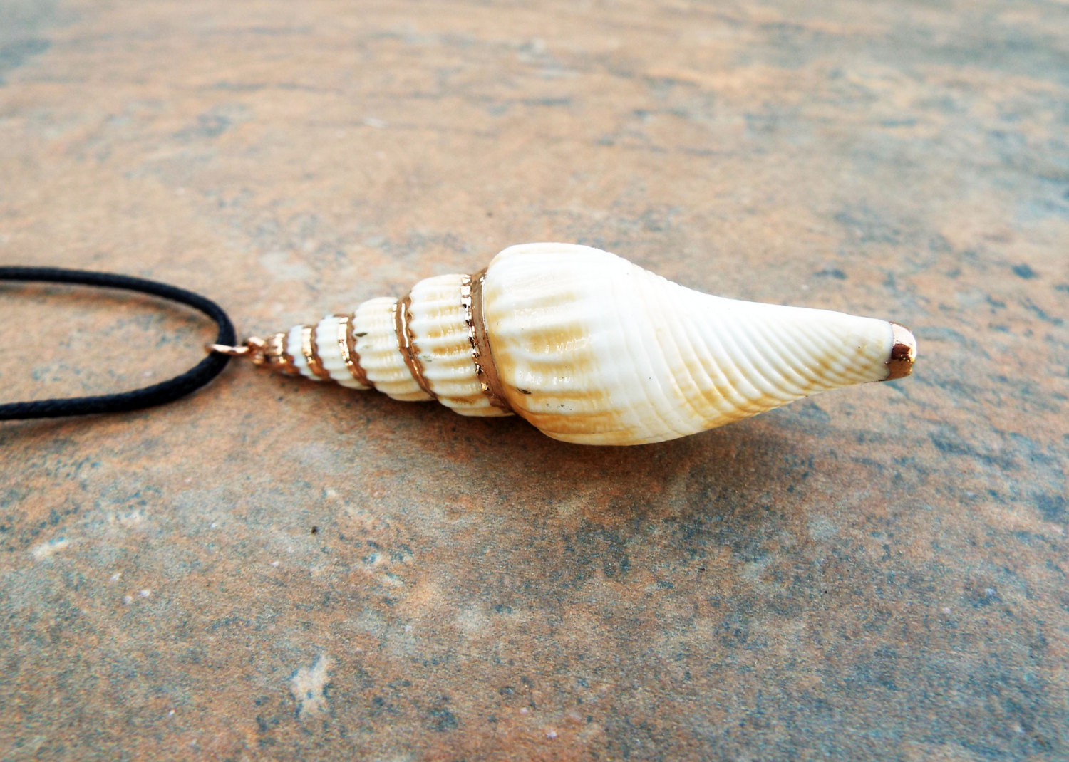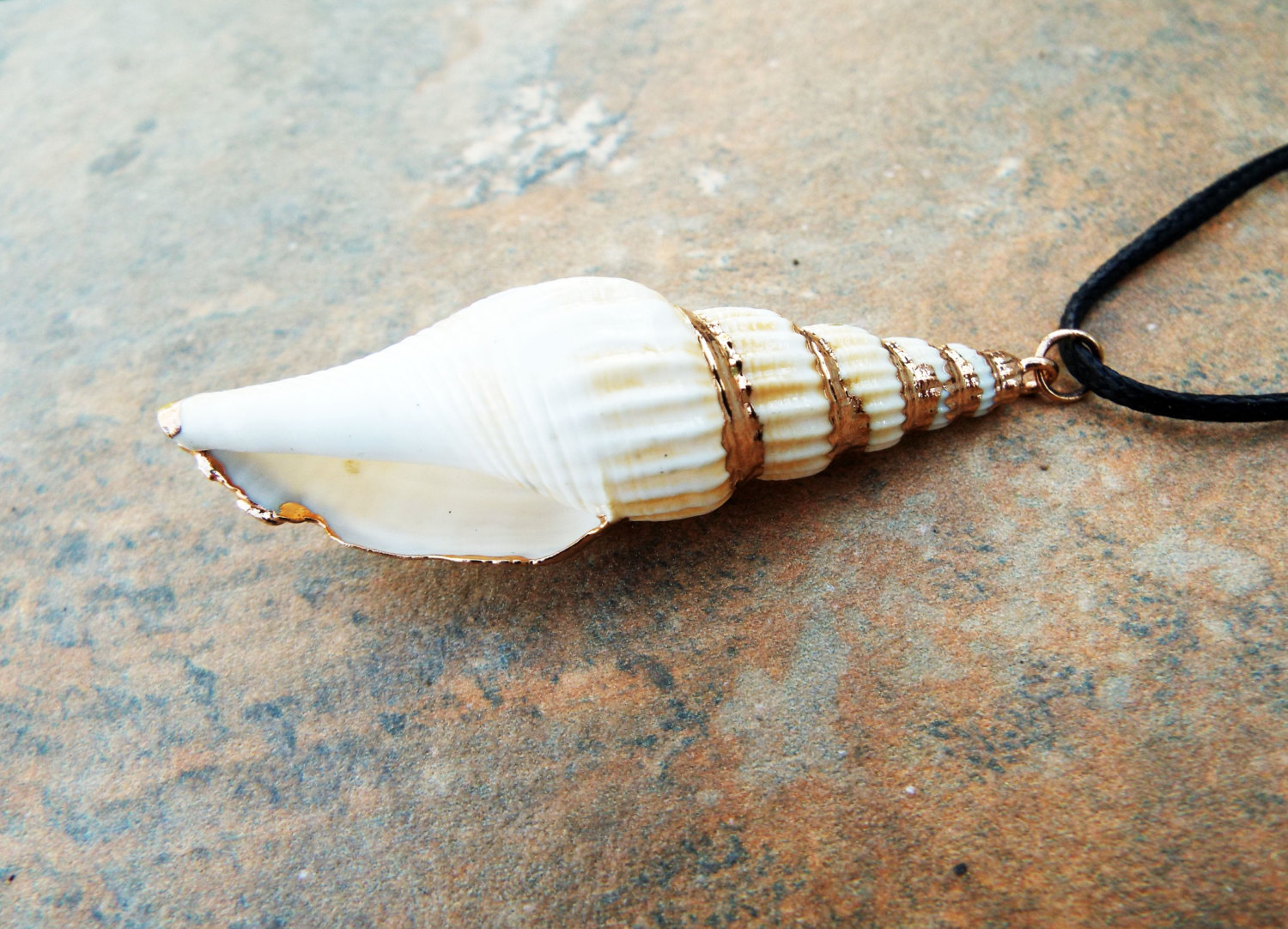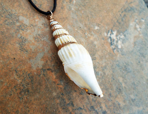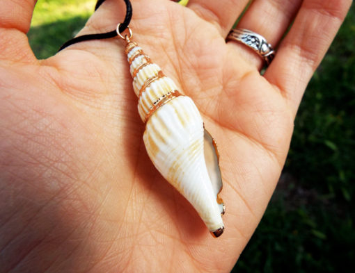 The shell will be sent with an adjustable black cotton strap, but it also looks great with any metal chain (silver, gold, bronze…etc).