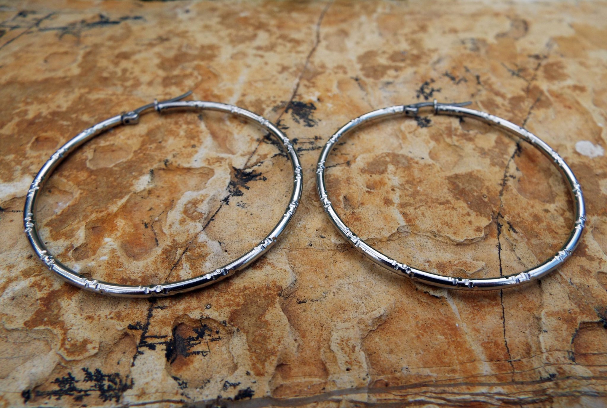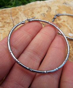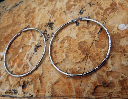 These traditional hoops have been handmade using silver stainless steel, and depict a Balinese design which dates back to centuries of existence. Stainless steel is incredibly solid so one has no fear of breakage or indentation. Also stainless steel never tarnishes and isn’t affected by the elements (fresh water, alcohol, air, seawater).