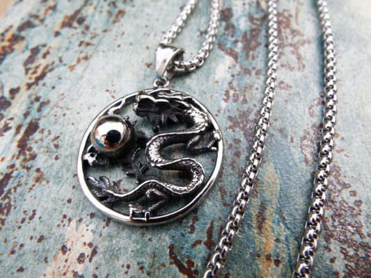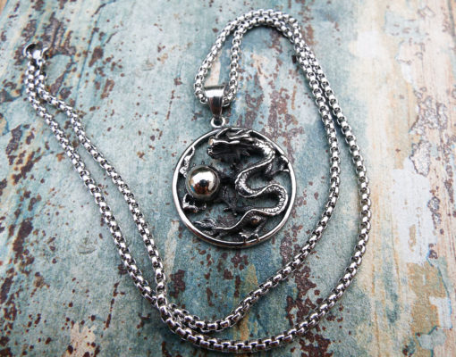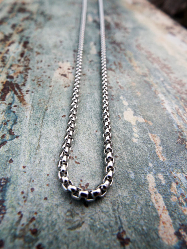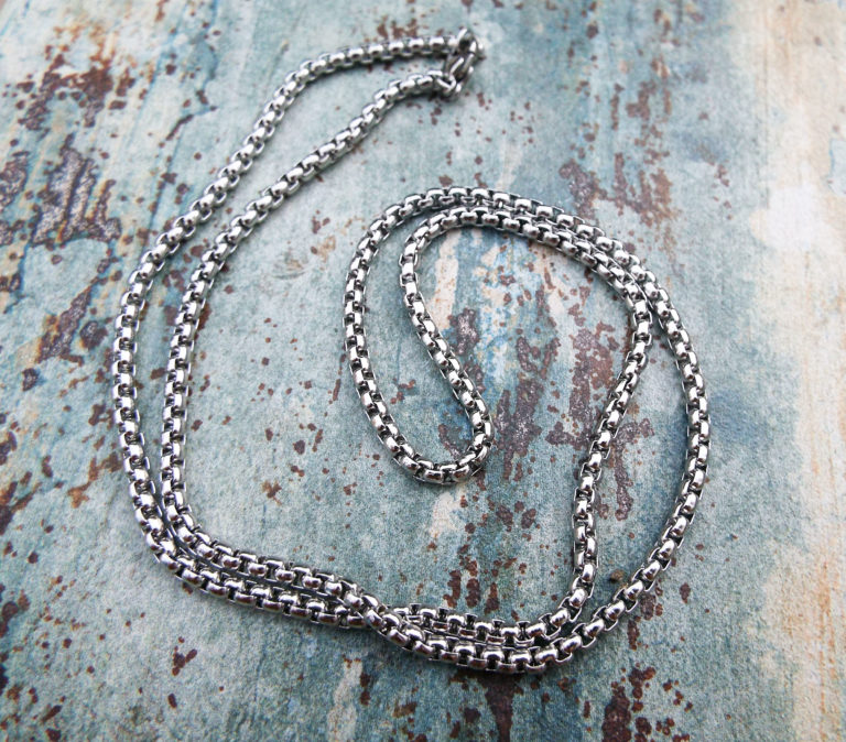 The chain is made from silver stainless steel, and has an easy ‘lobster’ clasp.