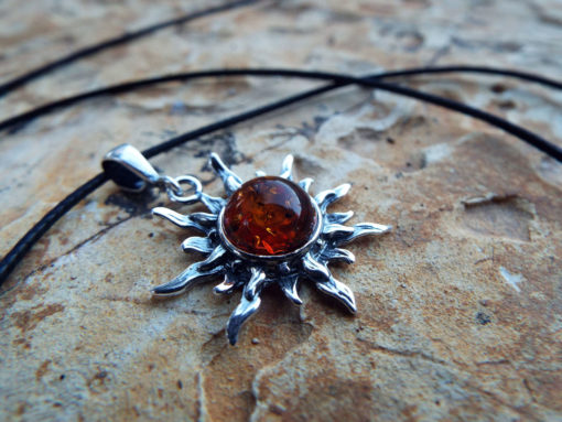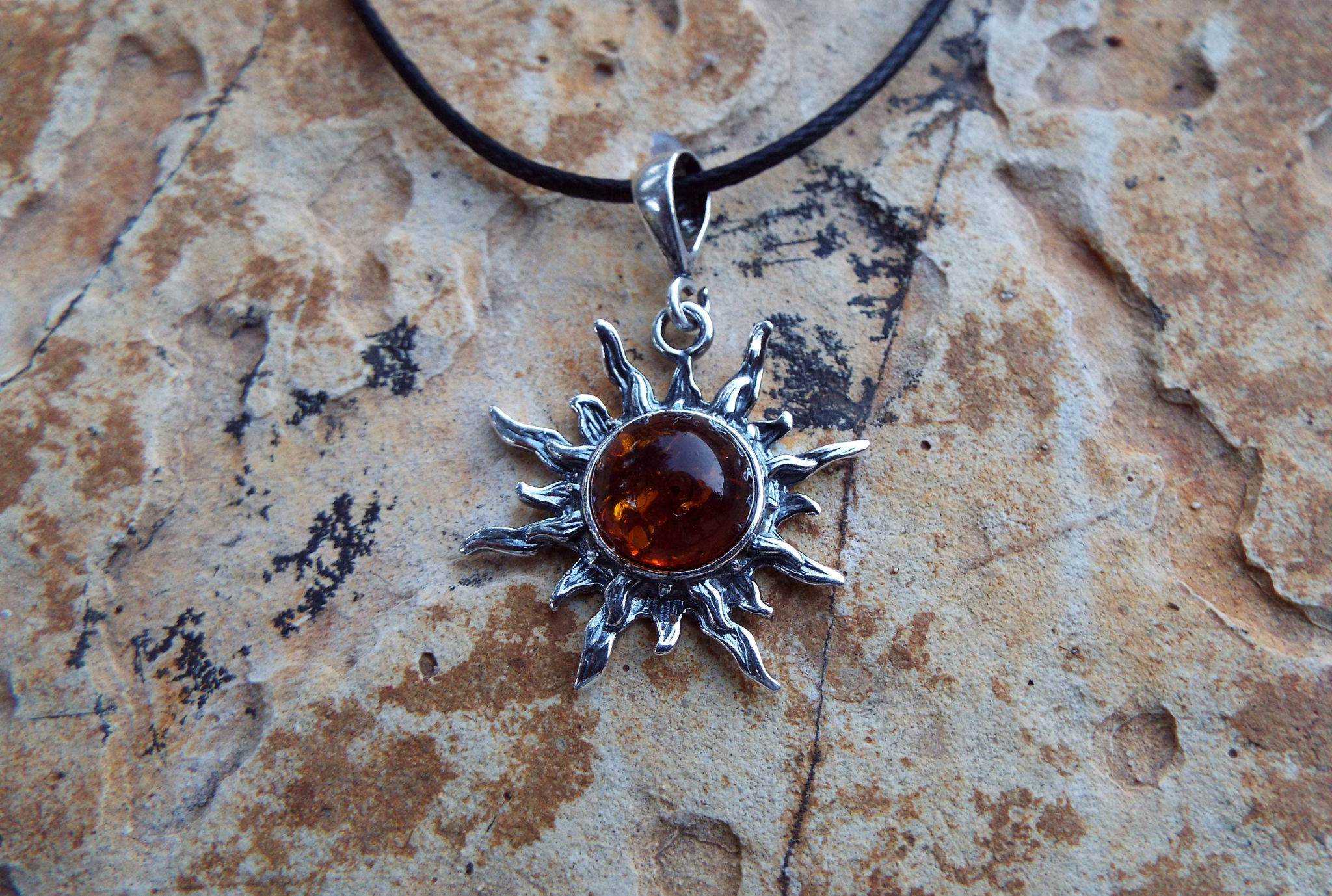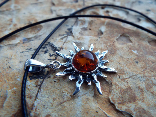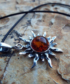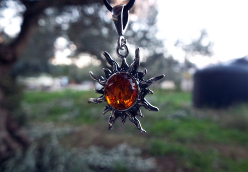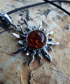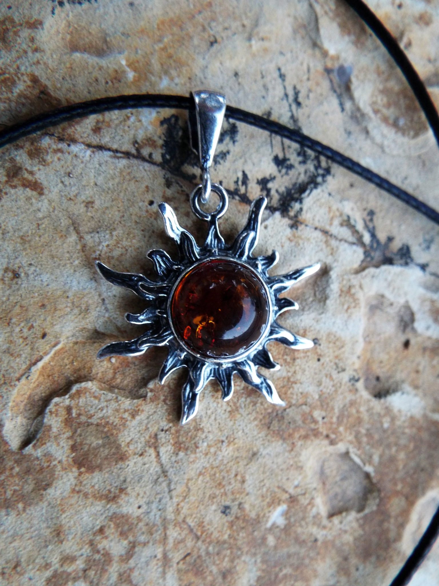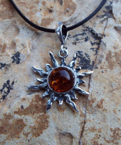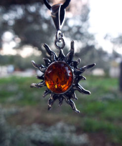 This lovely amber sits in a handmade sterling silver 925 sun symbol, which brings together the elements and brings good luck to the wearer. The amber enhances the energies of the symbol as it has the power of sunshine; bringing positive and happy surroundings.