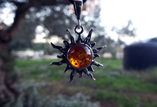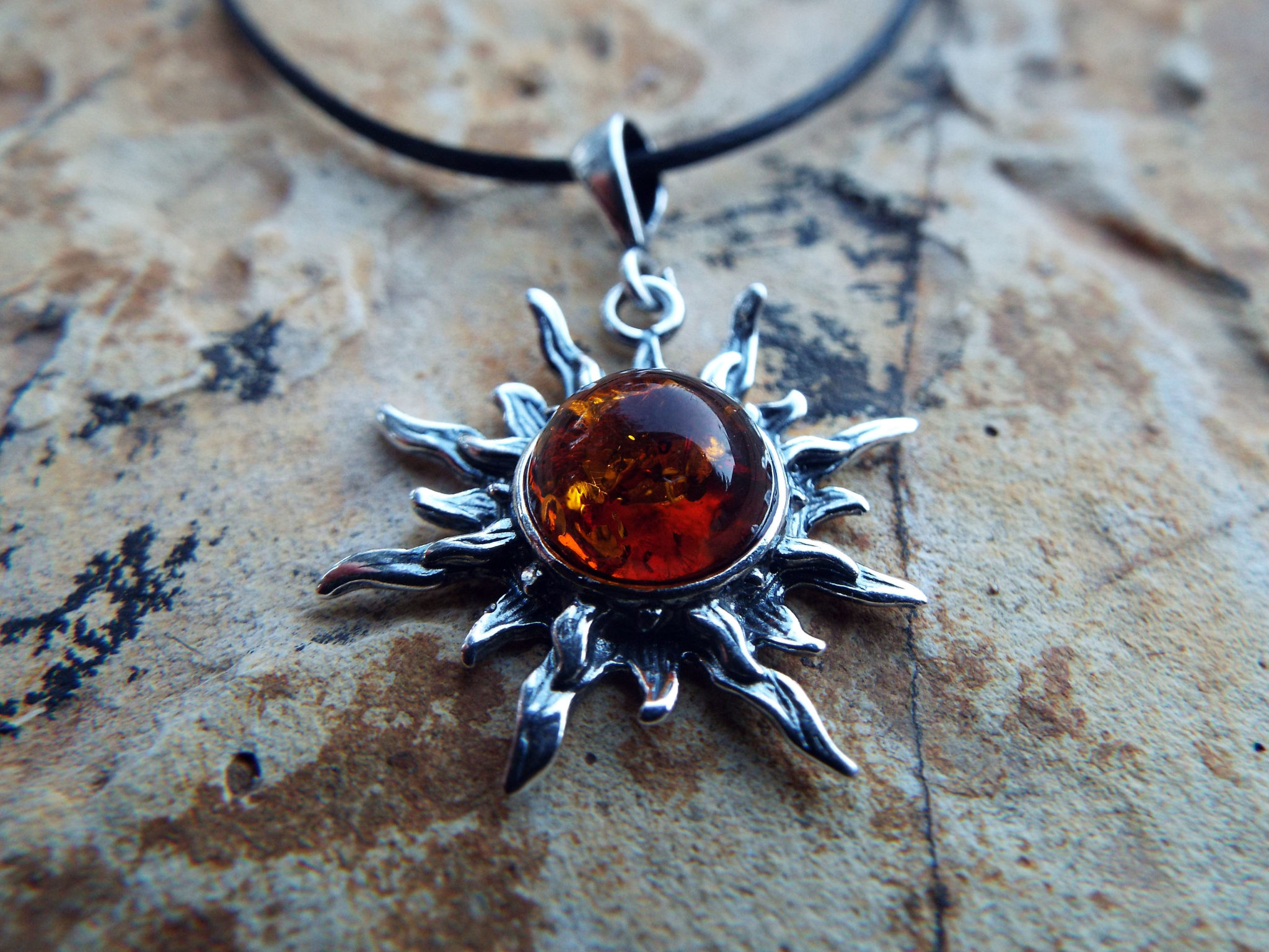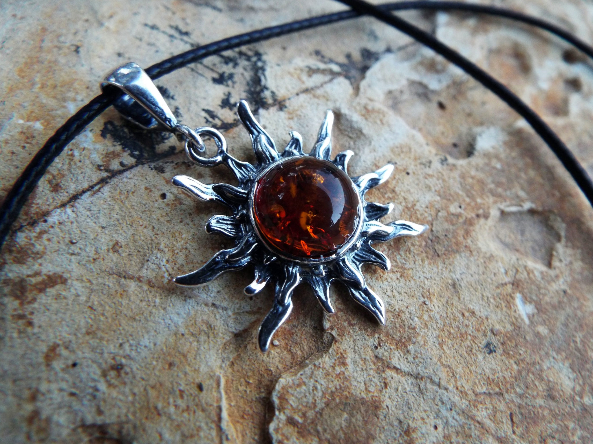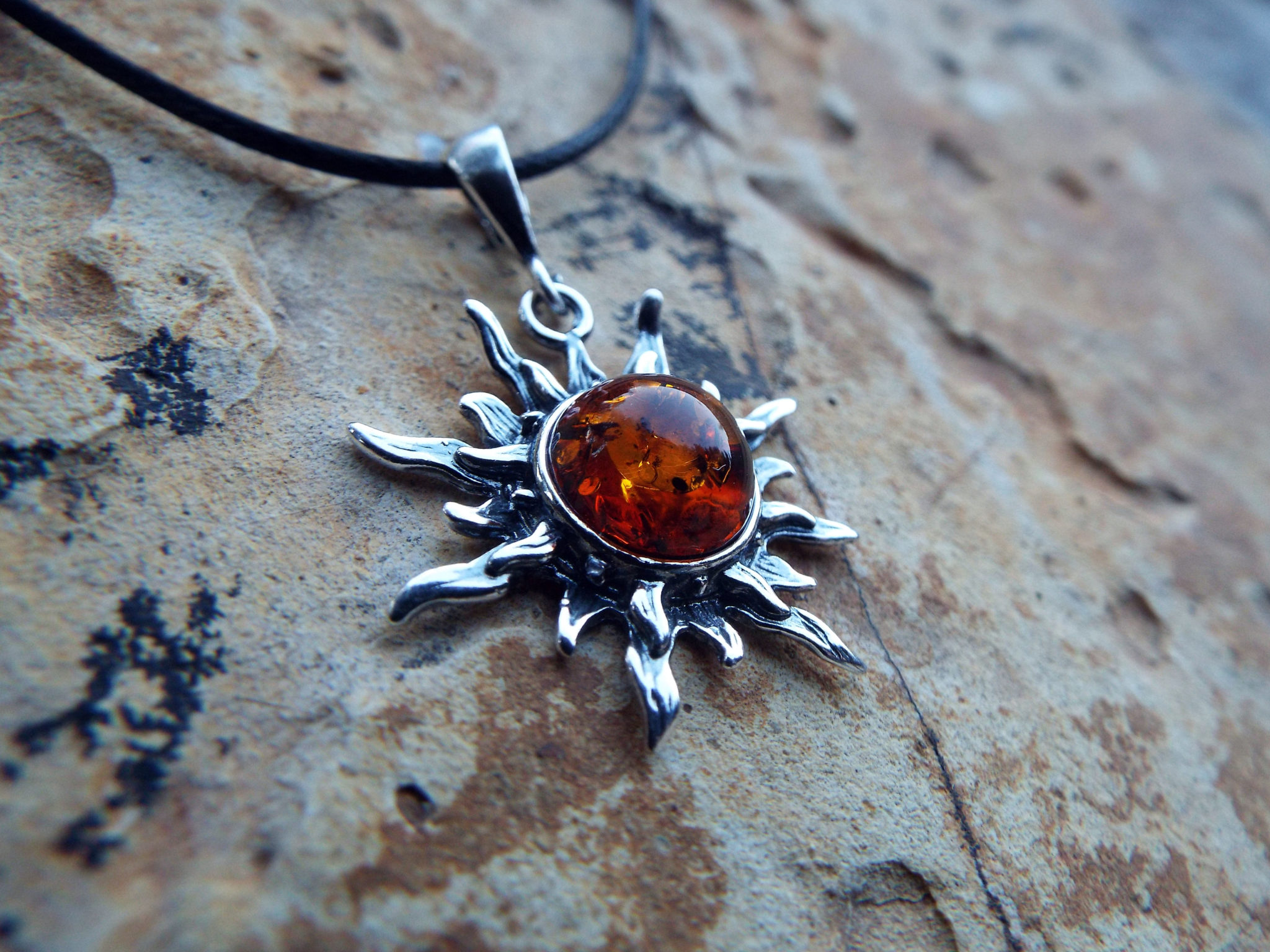 This lovely amber sits in a handmade sterling silver 925 sun symbol, which brings together the elements and brings good luck to the wearer. The amber enhances the energies of the symbol as it has the power of sunshine; bringing positive and happy surroundings.