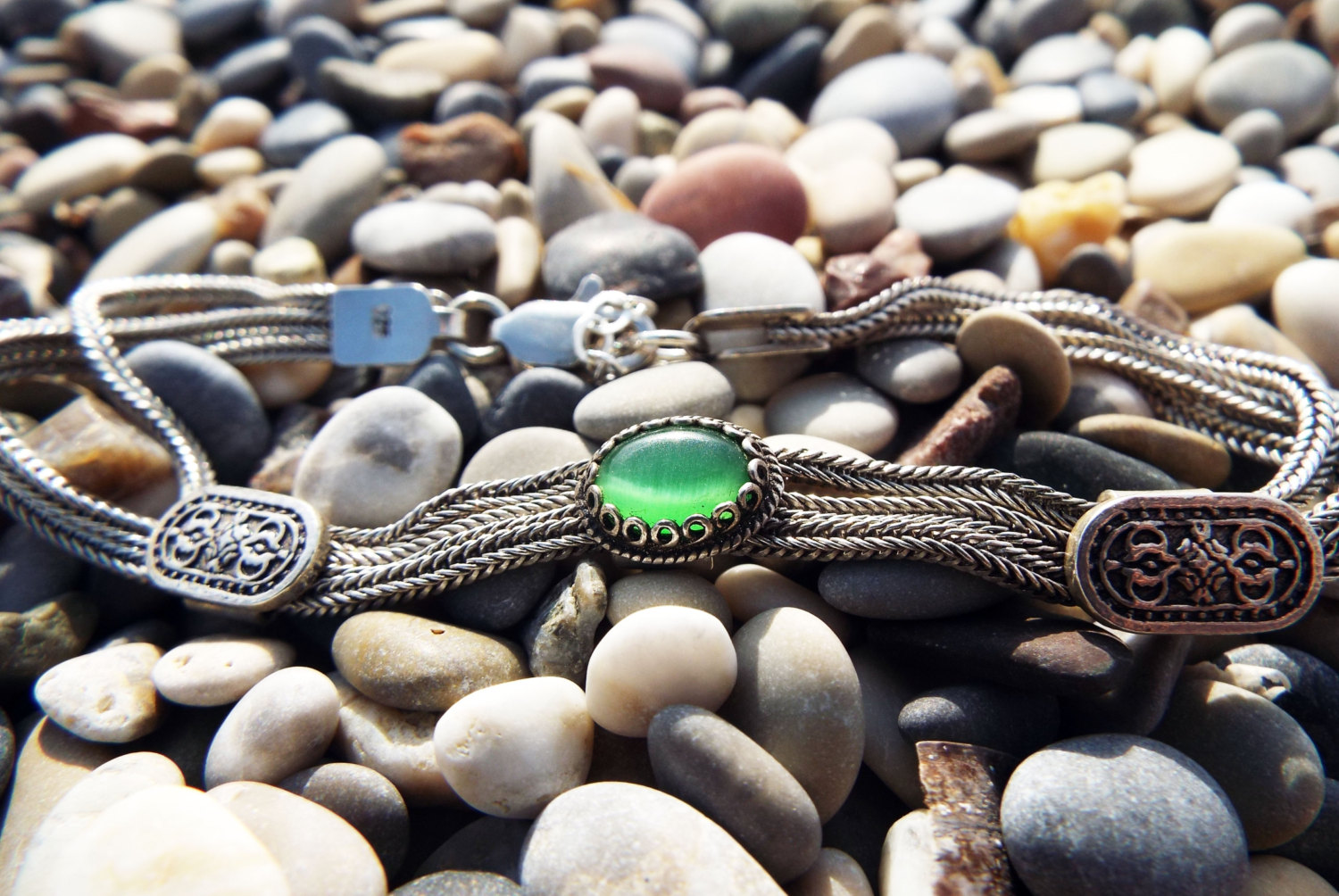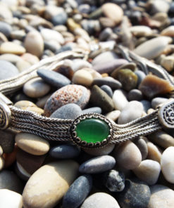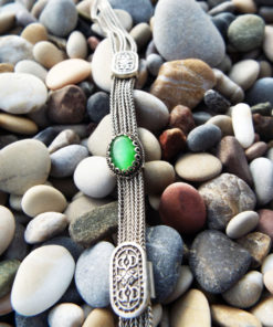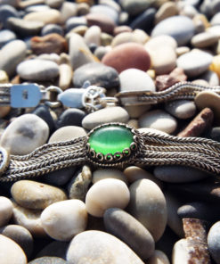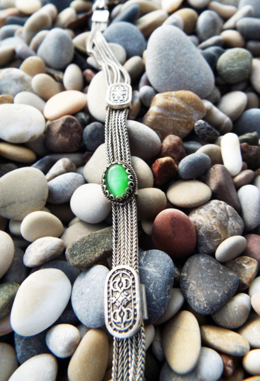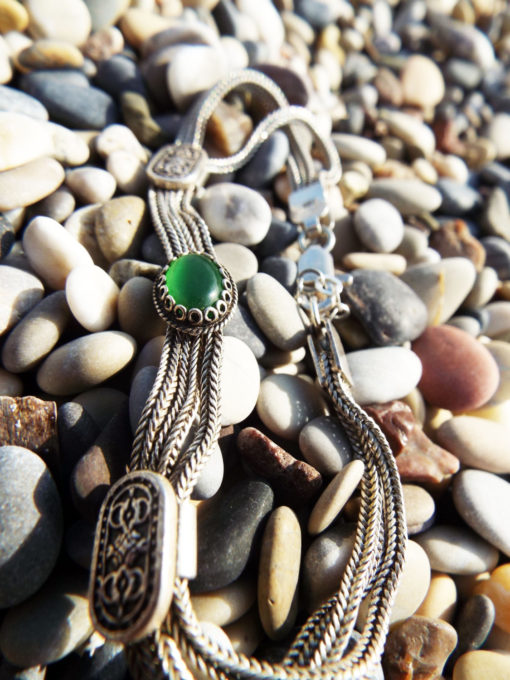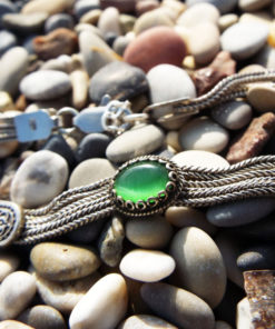 The bracelet has a sterling silver adjustable chain with a clasp.